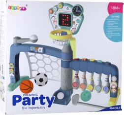 - bránka so sieťou, basketbalový kôš, tabuľa s LED bodovaním a zvukom, lopta na futbal, lopta na basketbal, guľa na kolky, loptička na golf, 5 farebných kolkov, baseballová pálka, golfová palica, hodiny na učenie času, 3 ozubené kolieska na cvičenie ruky, návod