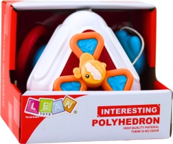 Na kocke nájdete otáčaciu vrtuľku, pohyblivý volant s hrkálkou, stláčacie tlačidlá a guličky aj odnímateľný prvok na šnúrke. Hra s prvkami rozvíja logické myslenie, manuálnu zručnosť a prirodzenú zvedavosť dieťaťa. Kocku možno tiež zavesiť pre pohodlnejšie používanie.