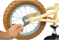 Pohodlné hnedé sedlo s rýchloupínaním umožňuje jednoduché nastavenie výšky. Mäkké rukoväte zabezpečujú bezpečný úchop pre malé ruky.
