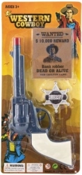 Staňte sa malým kovbojom! Tento plastový revolver so šerifským odznakom poteší všetkých malých pištolníkov. Zbraň vydáva klapací zvuk, súčasťou je tiež odznak šerifa a plagát „Hľadaný“ pre ešte väčšiu porciu zábavy. Ideálna hračka pre deti od 3 rokov.