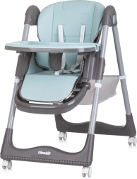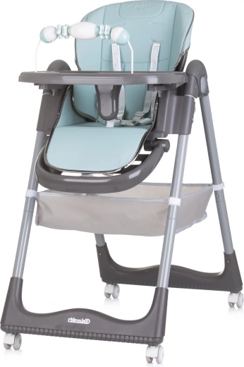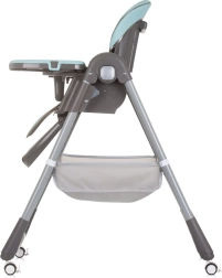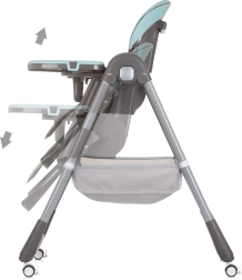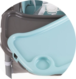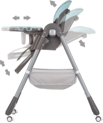 Dvojitý podnos s hornou odnímateľnou časťou uľahčuje údržbu a posuv v 4 polohách sa prispôsobí každej situácii. Hrazdička s hračkami zabaví bábätko, zatiaľ čo vy môžete v pokoji prestierať. Štyri kolieska uľahčia presun po byte a úložný kôš udrží všetky potrebné drobnosti po ruke. Po jedle stoličku rýchlo a kompaktne zložíte pre úsporu miesta.