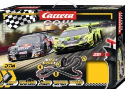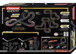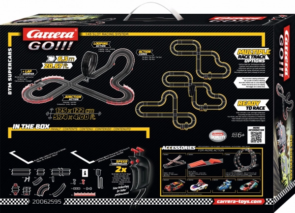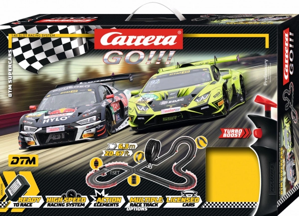Zažite napínavé preteky s autodráhou CARRERA GO DTM Supercars s dĺžkou 6,3 m a skvelými modelmi Audi R8 LMS GT3 a Lamborghini Huracán GT3. Set ponúka klopené zákruty, looping, križovatku a mechanické počítadlo kôl pre skutočnú pretekársku atmosféru. Vďaka turbo ovládačom, dvojitým kontaktným kefkám a magnetom autá výborne držia na trati a poskytujú rýchlu a plynulú jazdu.