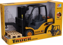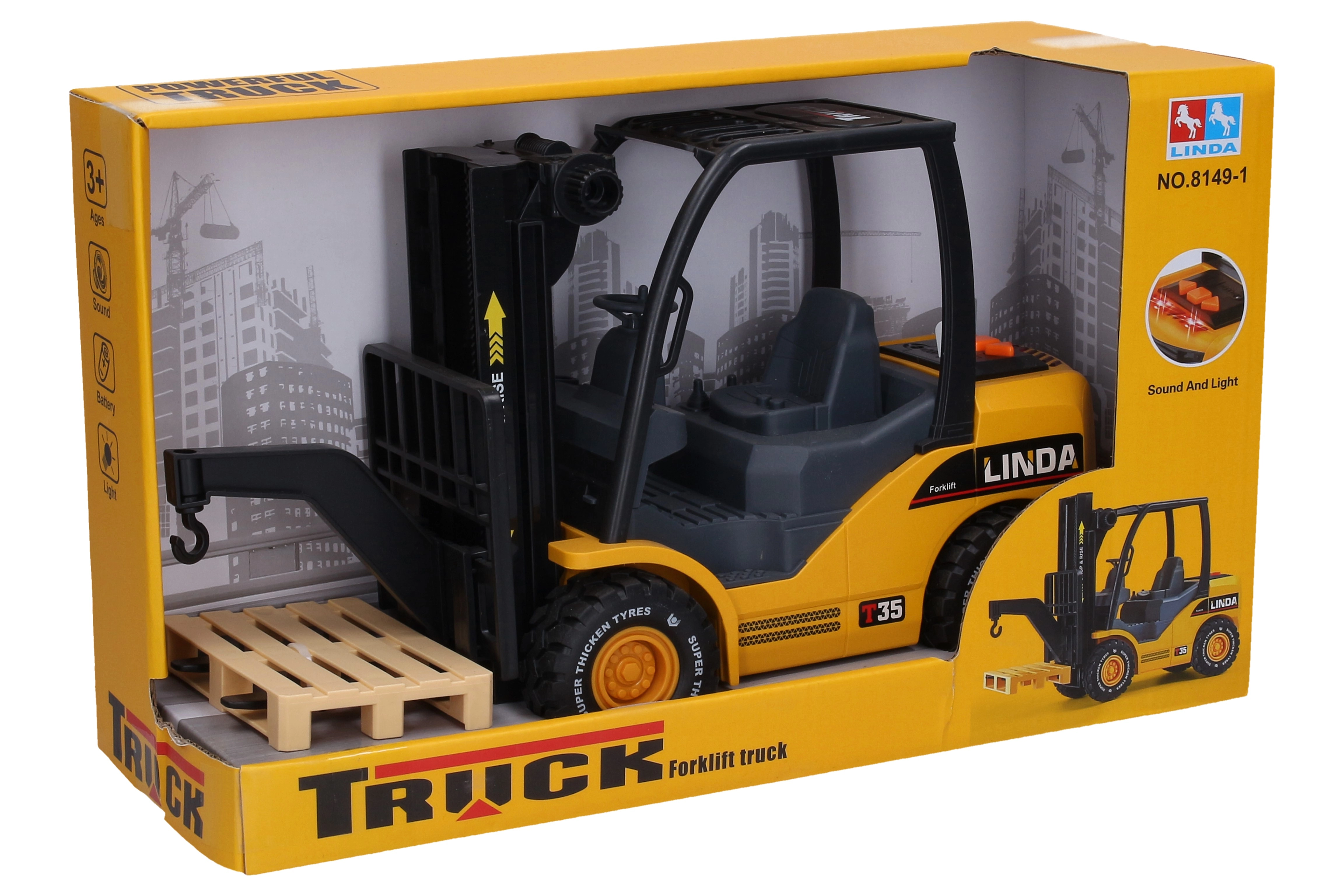 Tento detailne spracovaný vysokozdvižný vozík poteší malých nadšencov stavebných a skladových strojov. Vďaka svetelným a zvukovým efektom (motor, zdvíhanie, trúbenie) a manuálnemu zdvihu predným kolieskom pôsobí pri hre veľmi realisticky. Aktivácia efektov prebieha tlačidlami v zadnej časti, takže deti majú všetko pohodlne po ruke.