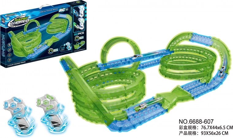 Táto veľká svietiaca pretekárska dráha premení každú detskú izbu na nočné preteky. Fluorescenčné prvky dráhy krásne žiaria v tme a autíčka s LED svetlami vytvárajú pri jazde pôsobivé svetelné efekty. Stavanie dráhy rozvíja predstavivosť a jemnú motoriku, samotná jazda zas podporuje koordináciu oko–ruka.