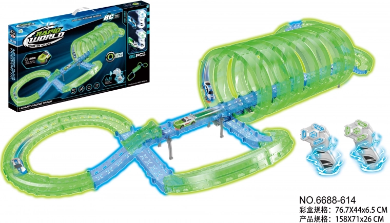 Veľká závodná dráha pre deti od 6 rokov prináša akčnú zábavu s dvoma autíčkami na diaľkové ovládanie. Dráha je fluorescenčná a svieti v tme, autíčka majú LED podsvietenie a vytvárajú pôsobivé svetelné efekty. Vďaka 360° slučkám a jednoduchej stavbe rozvíjajú koordináciu, predstavivosť a jemnú motoriku detí.