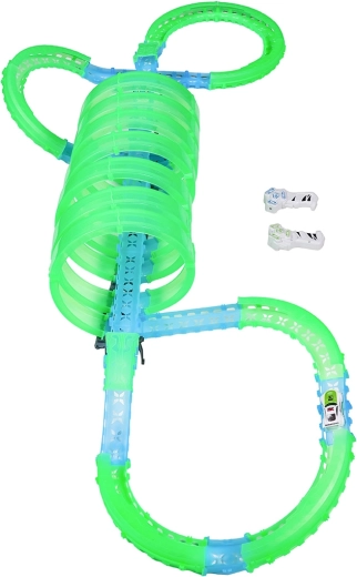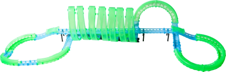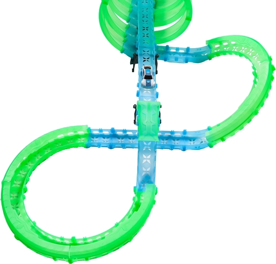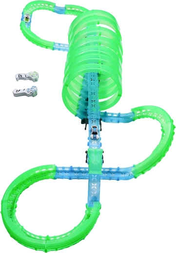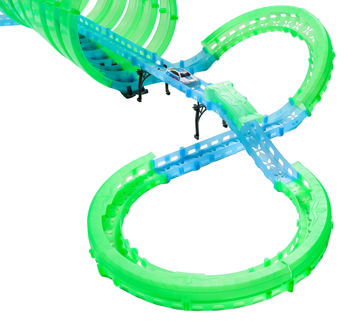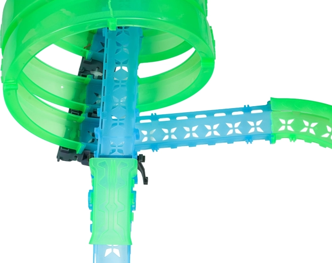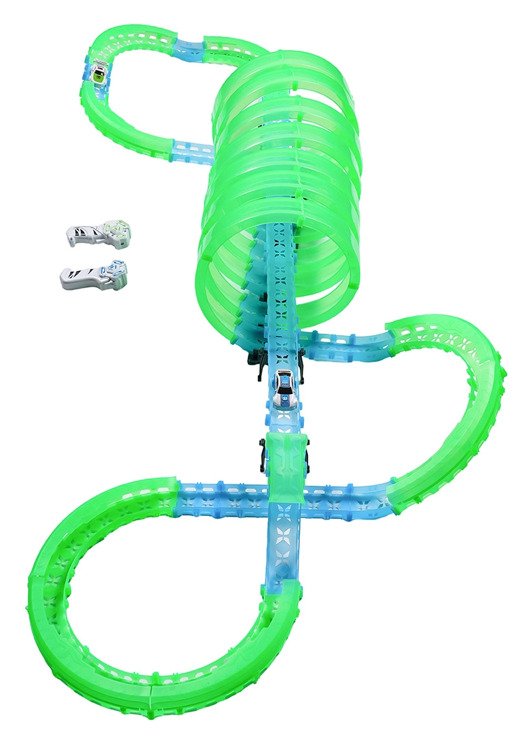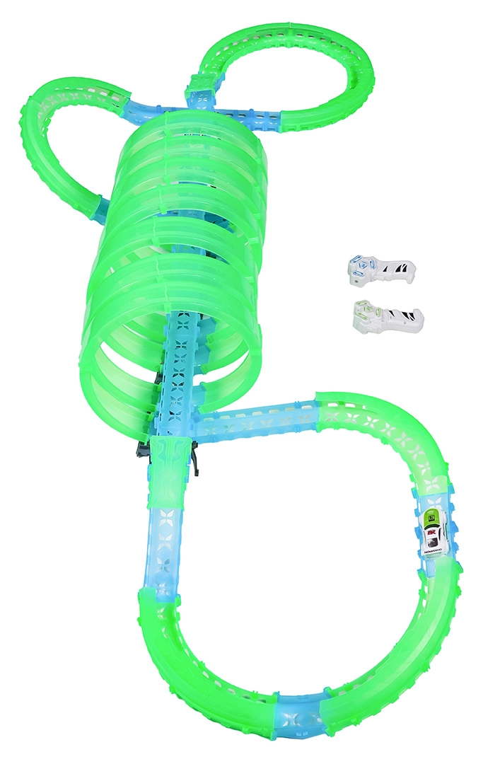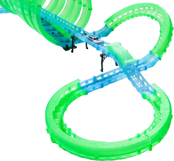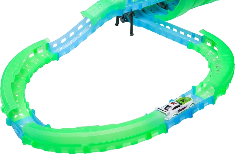 Táto modulárna pretekárska dráha zo svetlovodných dielov v neónovo zelenej a modrej farbe sa ľahko zacvakáva a umožňuje rýchle prestavby. Fluorescenčný materiál sa po nasvietení rozžiari a v kombinácii s LED autíčkami premení izbu na pútavú svetelnú arénu.