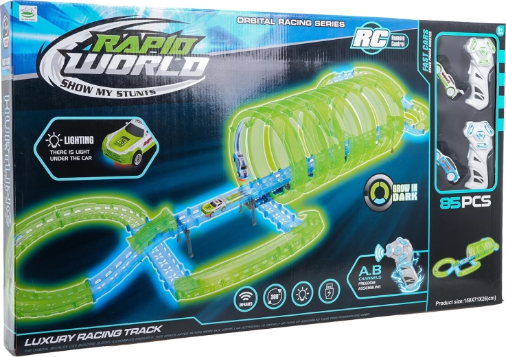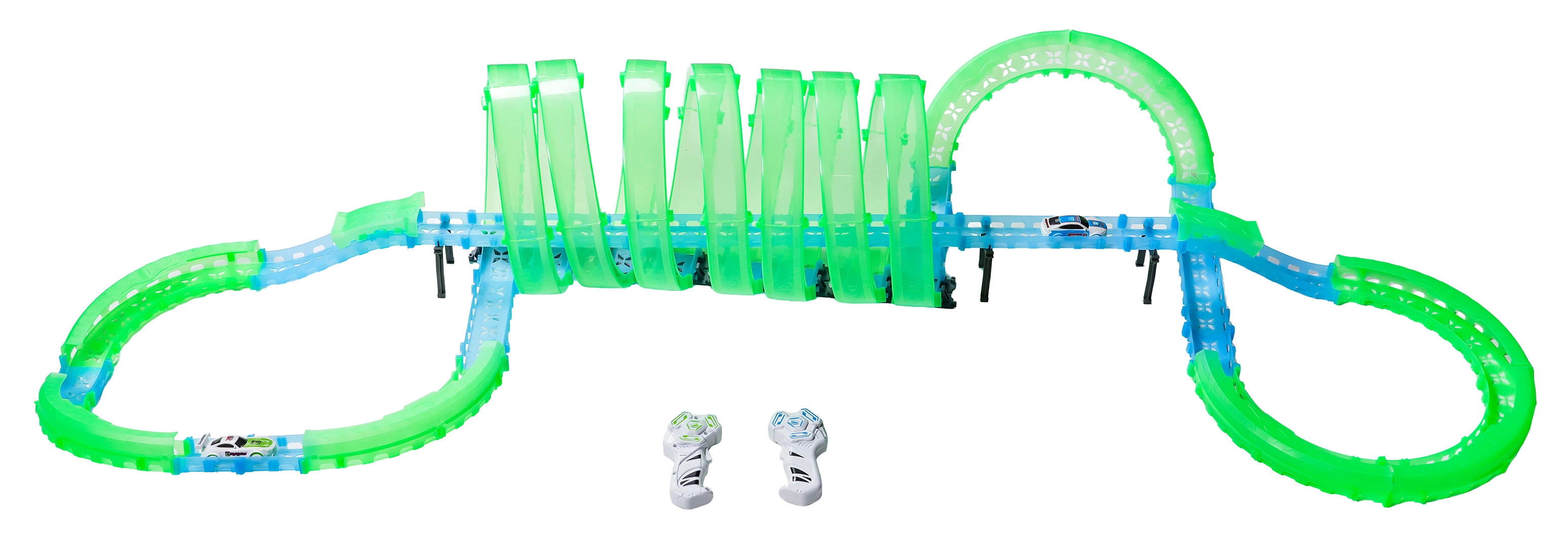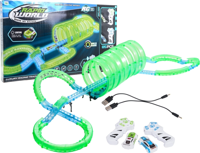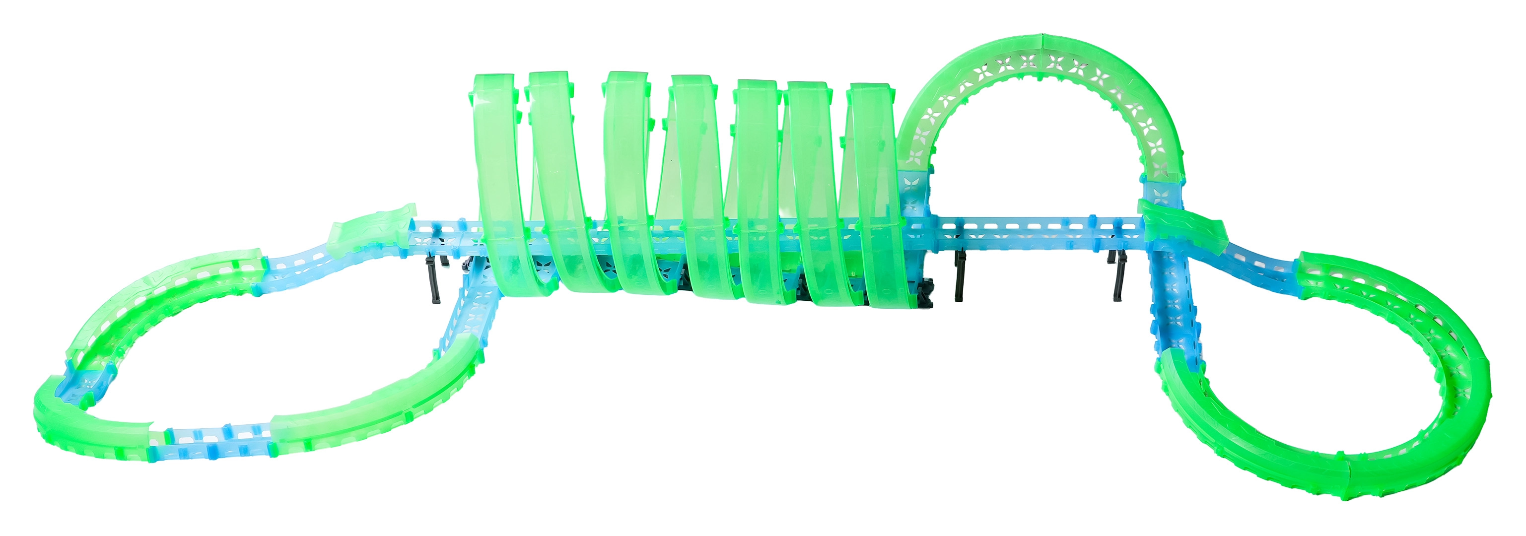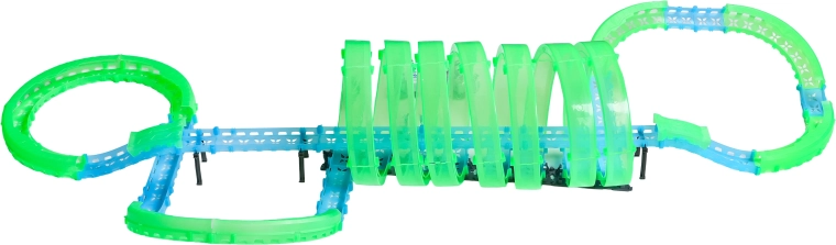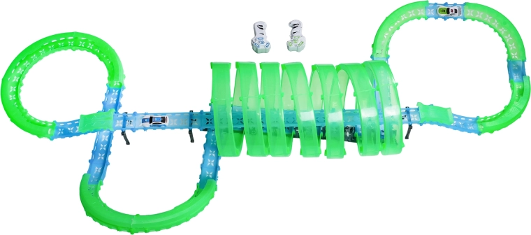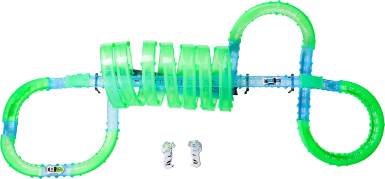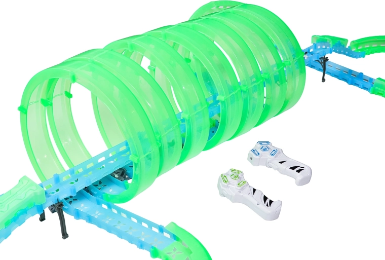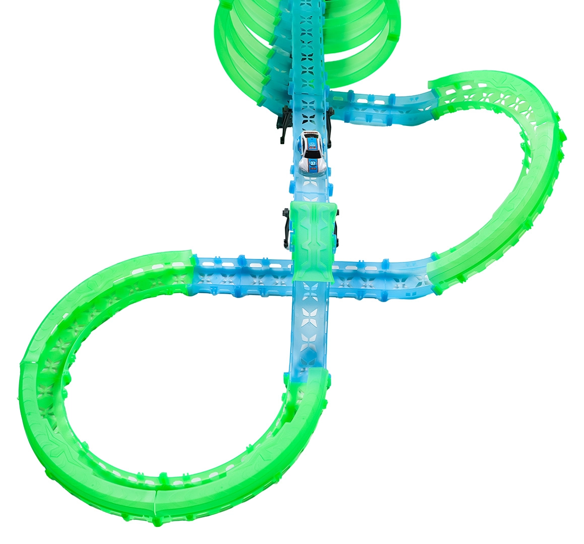 Táto modulárna pretekárska dráha zo svetlovodných dielov v neónovo zelenej a modrej farbe sa ľahko zacvakáva a umožňuje rýchle prestavby. Fluorescenčný materiál sa po nasvietení rozžiari a v kombinácii s LED autíčkami premení izbu na pútavú svetelnú arénu.