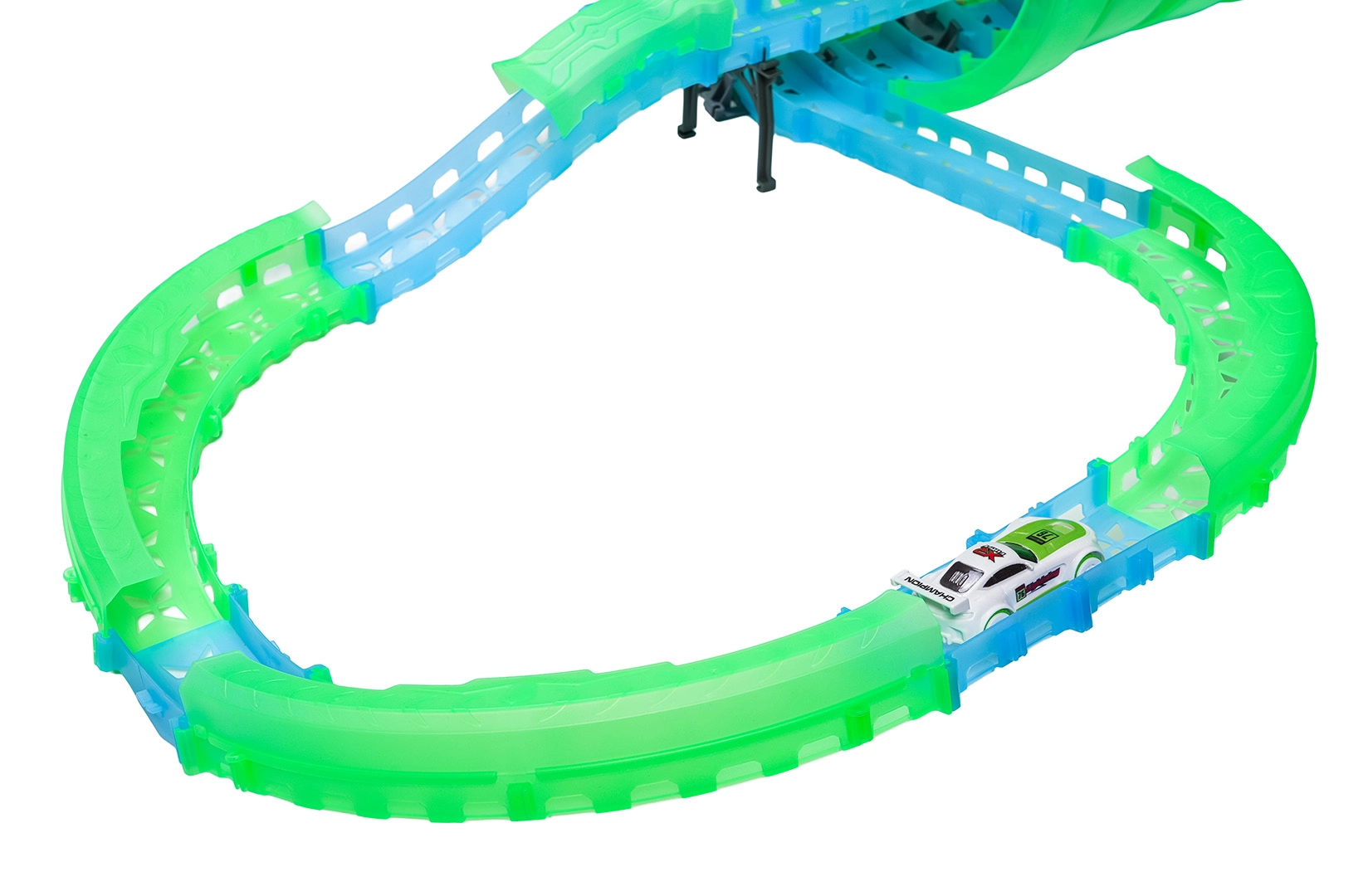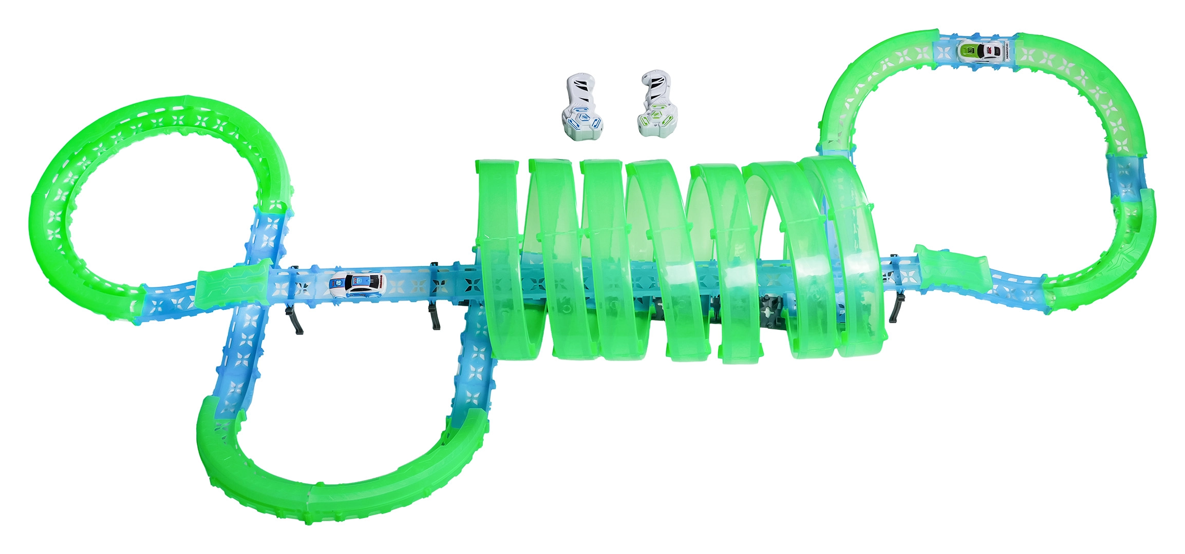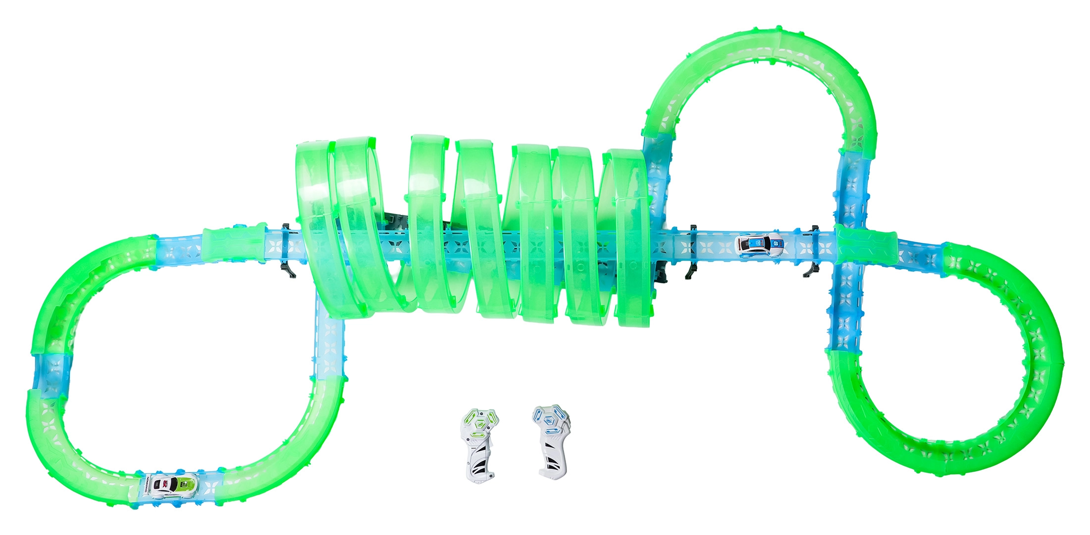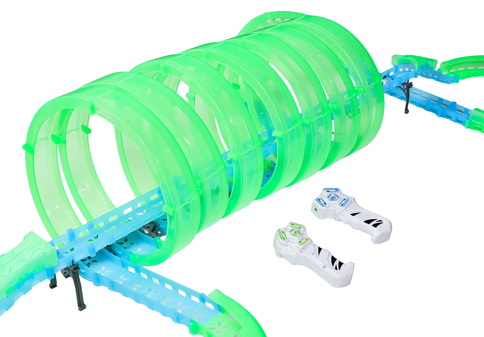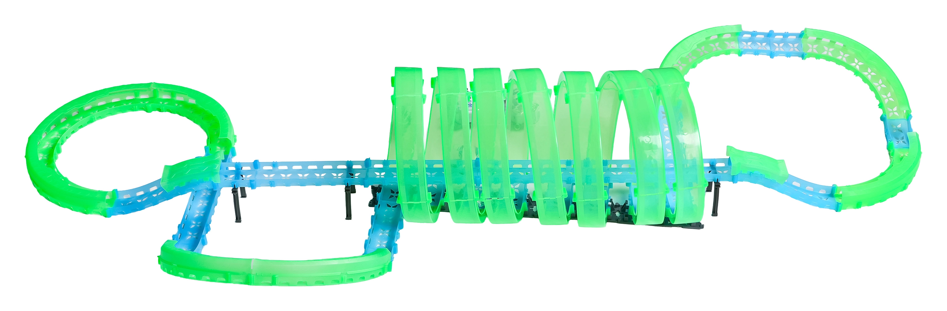 Táto modulárna pretekárska dráha zo svetlovodných dielov v neónovo zelenej a modrej farbe sa ľahko zacvakáva a umožňuje rýchle prestavby. Fluorescenčný materiál sa po nasvietení rozžiari a v kombinácii s LED autíčkami premení izbu na pútavú svetelnú arénu.