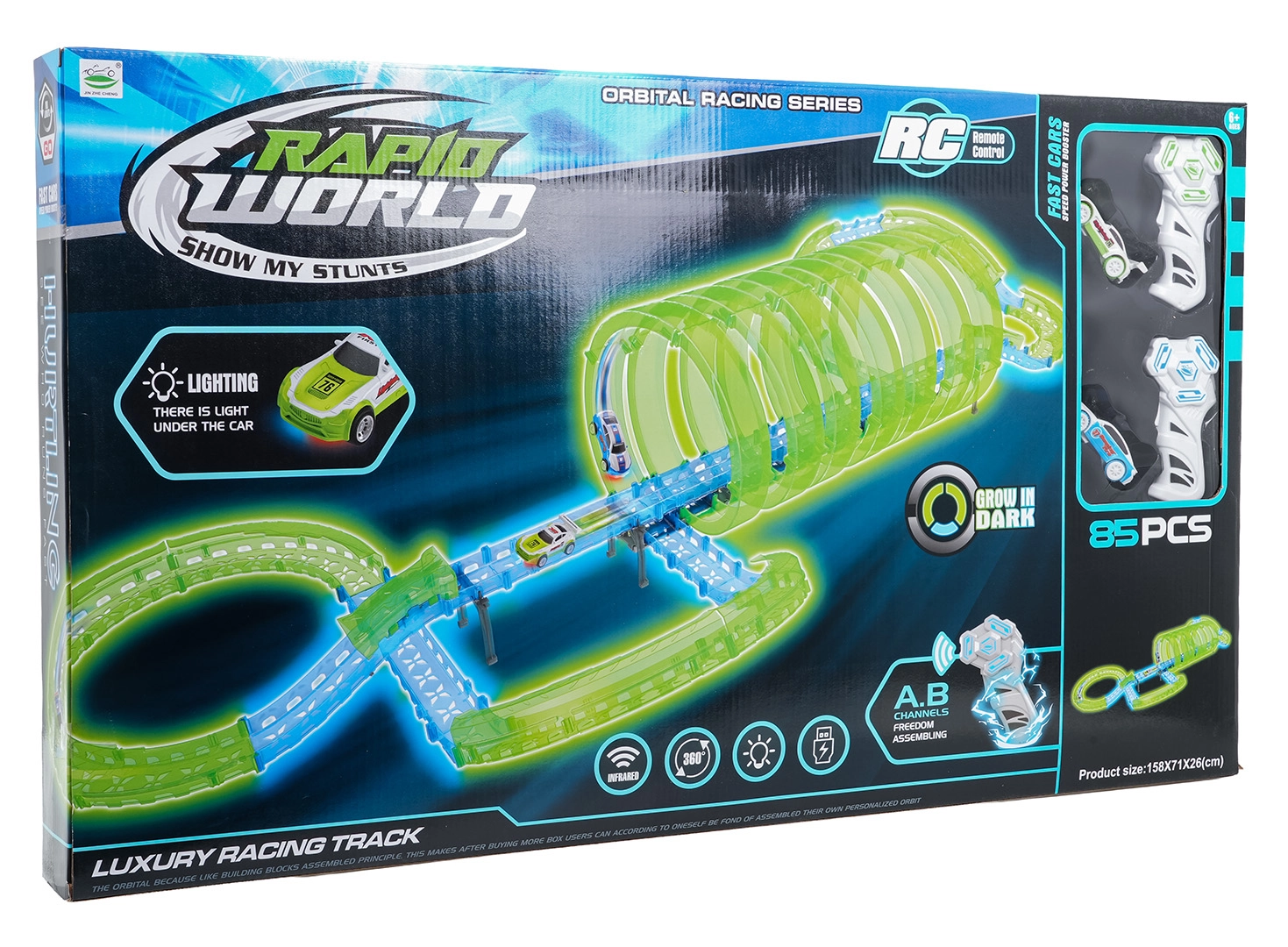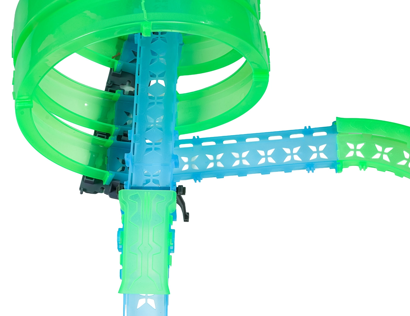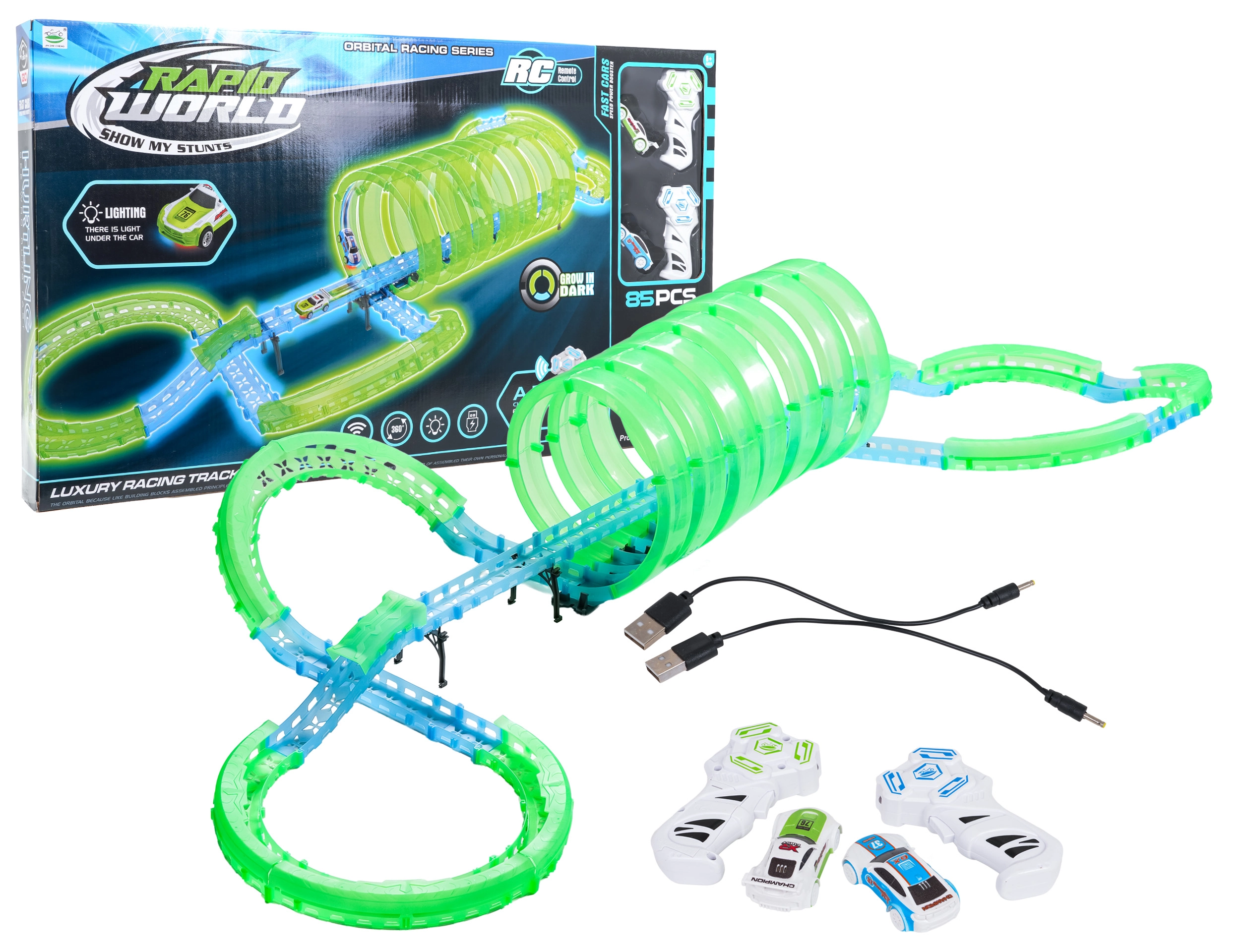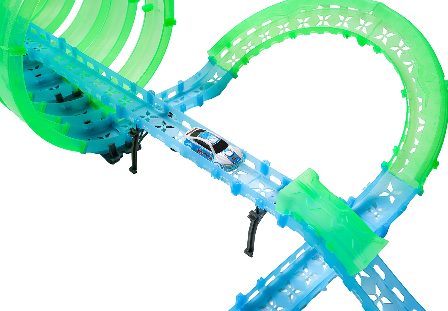 Táto modulárna pretekárska dráha zo svetlovodných dielov v neónovo zelenej a modrej farbe sa ľahko zacvakáva a umožňuje rýchle prestavby. Fluorescenčný materiál sa po nasvietení rozžiari a v kombinácii s LED autíčkami premení izbu na pútavú svetelnú arénu.