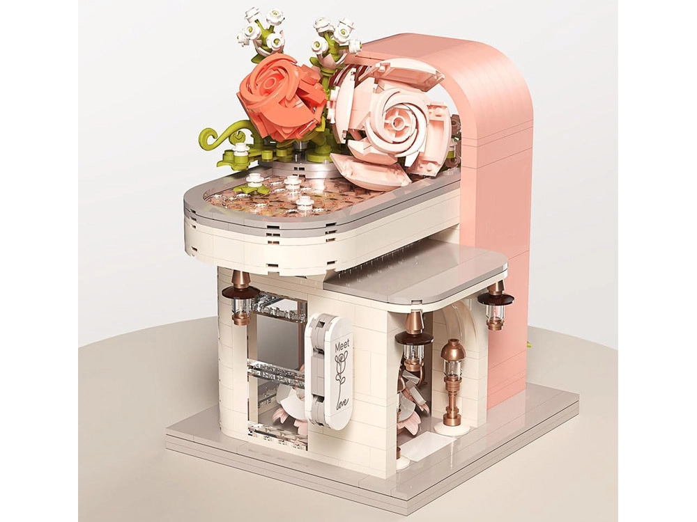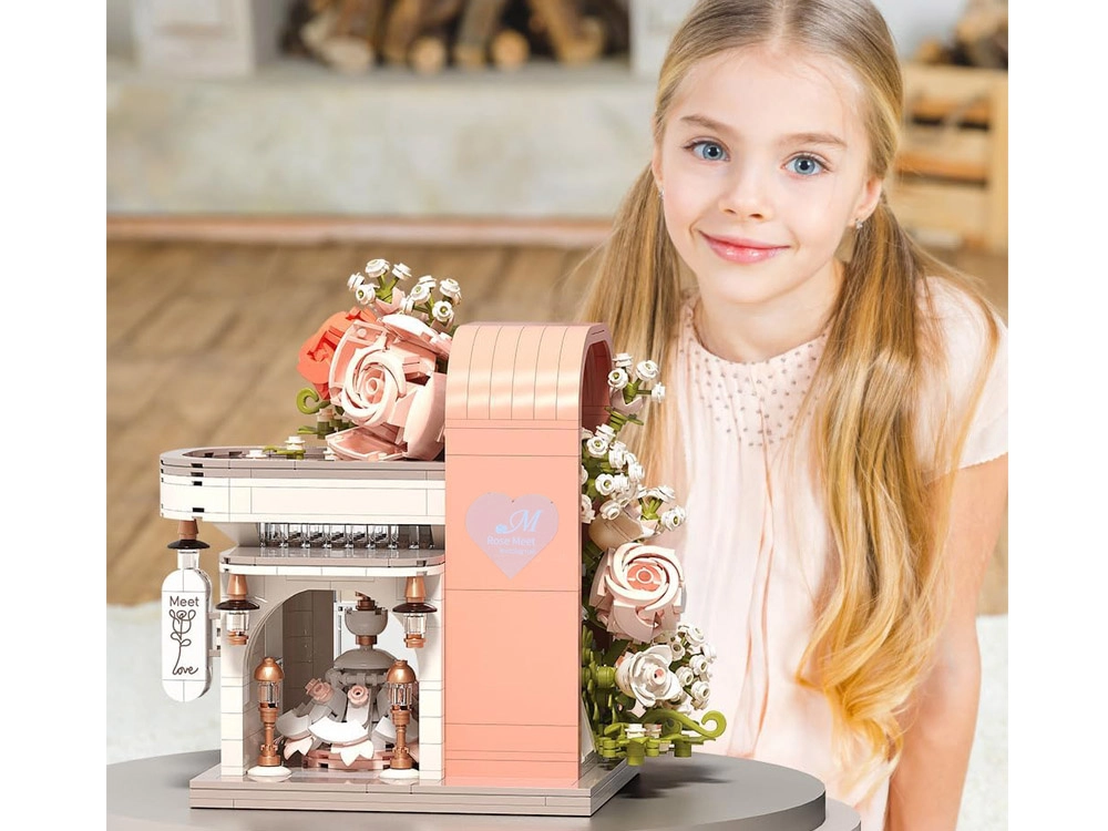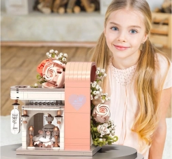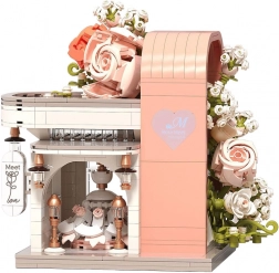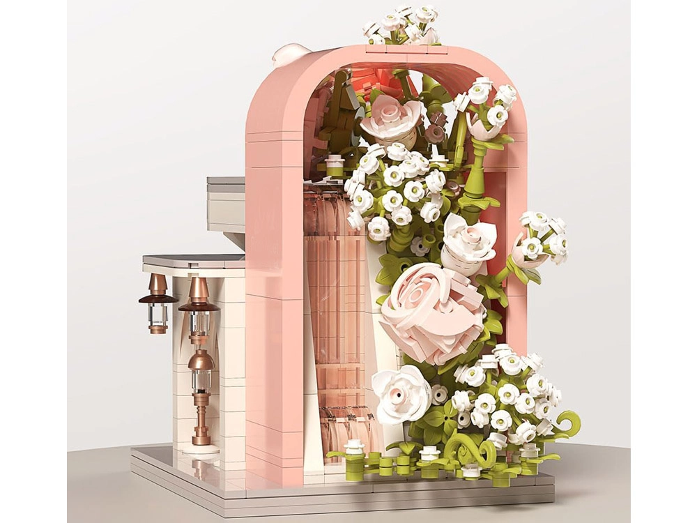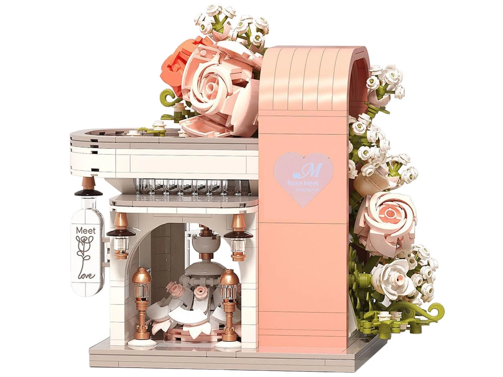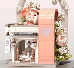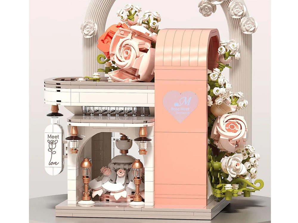 Táto romantická stavebnica premení váš stôl na malebnú svadobnú scénu. Elegantný výklad s „preskleným“ čelom odhaľuje hlavnú hviezdu – svadobné šaty s jemnými ružovými detailmi, ktoré ladia s bielou, púdrovo ružovou a pastelovo zelenou. Konštrukciu obopínajú bohaté kvetinové girlandy, ozdoby na streche a drobné lampy pri vchode, vďaka čomu model pôsobí ako rozprávkový výklad.
