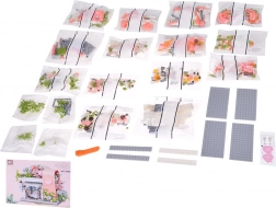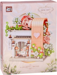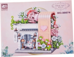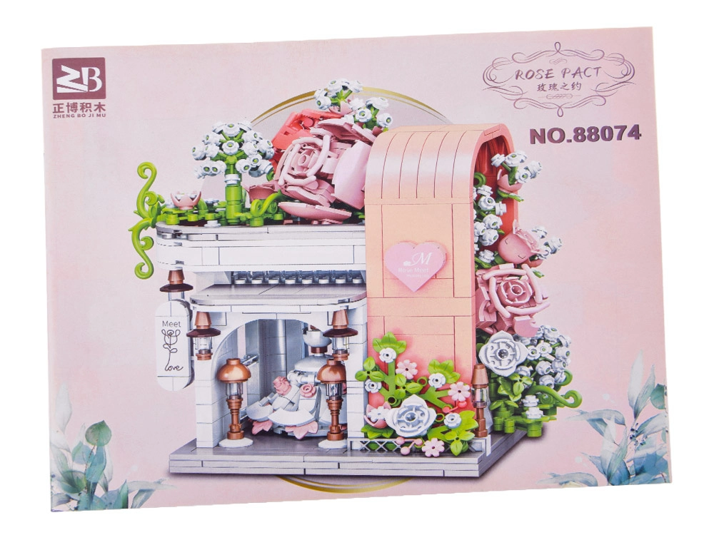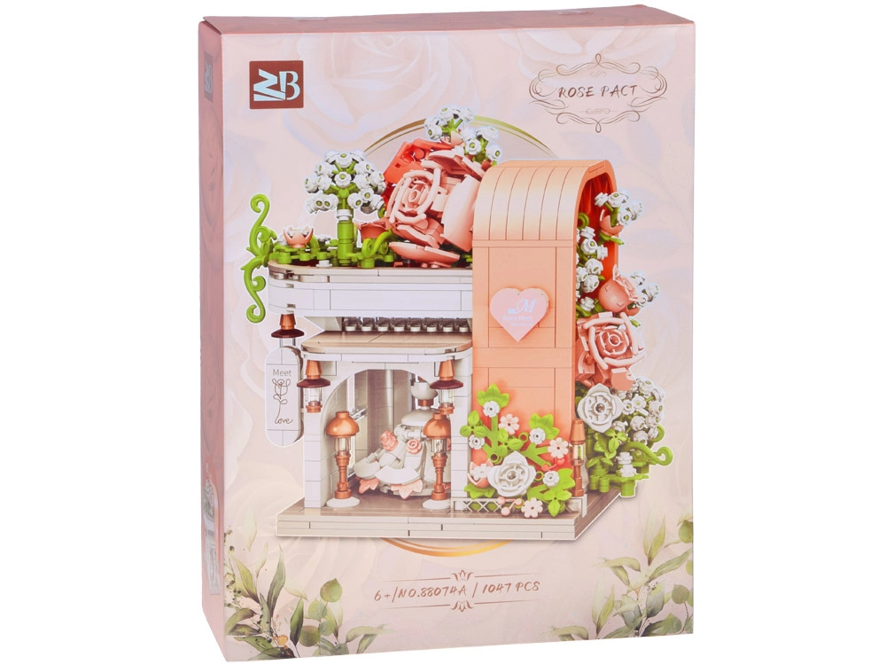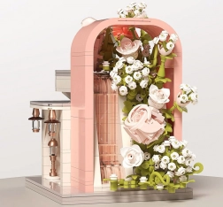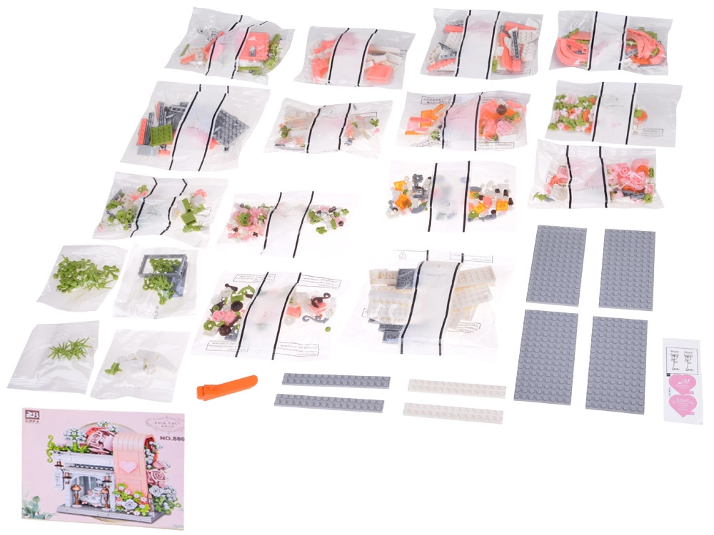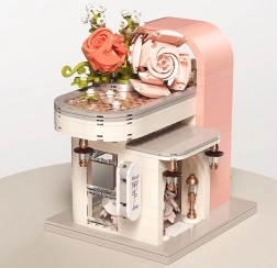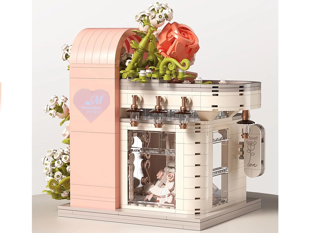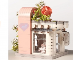 Táto romantická stavebnica premení váš stôl na malebnú svadobnú scénu. Elegantný výklad s „preskleným“ čelom odhaľuje hlavnú hviezdu – svadobné šaty s jemnými ružovými detailmi, ktoré ladia s bielou, púdrovo ružovou a pastelovo zelenou. Konštrukciu obopínajú bohaté kvetinové girlandy, ozdoby na streche a drobné lampy pri vchode, vďaka čomu model pôsobí ako rozprávkový výklad.