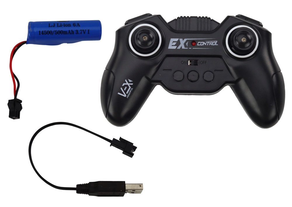 V balení nájdete ovládač, Li‑ion akumulátor 3,7 V, USB nabíjací kábel. Stačí vložiť batérie do ovládača a vyraziť.