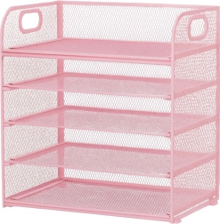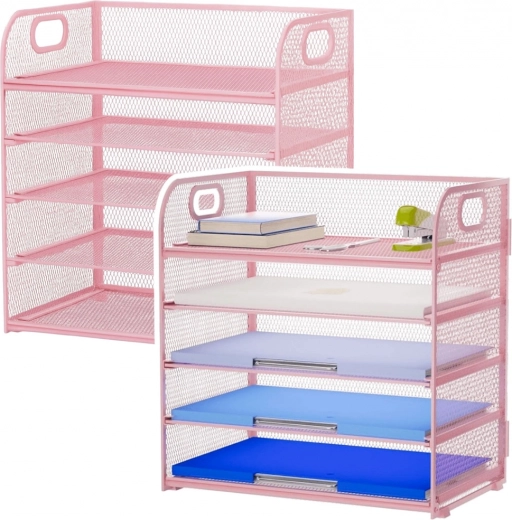 Štýlový ružový stolový organizér s 5 priestrannými úrovňami pomôže udržať poriadok v dokumentoch, zošitoch a kancelárskych doplnkoch. Odolná kovová sieťovina s práškovým lakom, bočné úchyty na ľahké prenášanie a stabilná konštrukcia robia z tohto organizéra ideálnu voľbu do kancelárie, home office aj študentskej izby.