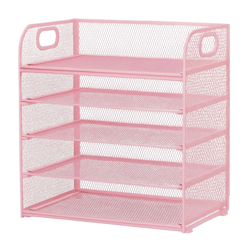 Zorganizujte si pracovnú plochu prehľadne a elegantne. Ružový kovový organizér ponúka päť praktických políc, do ktorých ľahko uložíte dokumenty, zložky, obaly, zošity aj drobné kancelárske potreby. Vďaka modernému vzhľadu z kovovej sieťoviny skvele zapadne do súčasných interiérov.