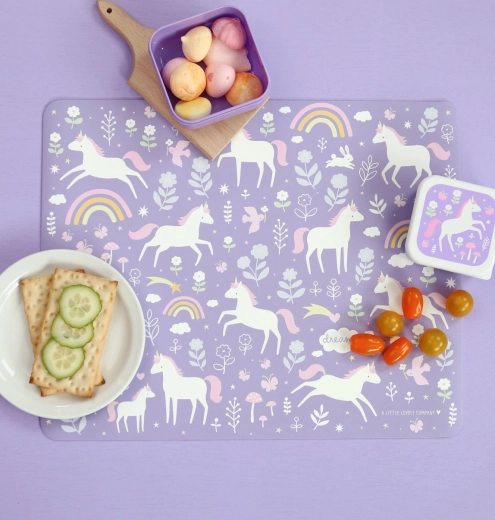 Veľkorysé rozmery poskytujú dostatok priestoru pre tanier, príbor aj pohár. Pastelová fialová s motívom jednorožcov a dúhy rozžiari detský stôl a podporí radostnú atmosféru pri jedle.