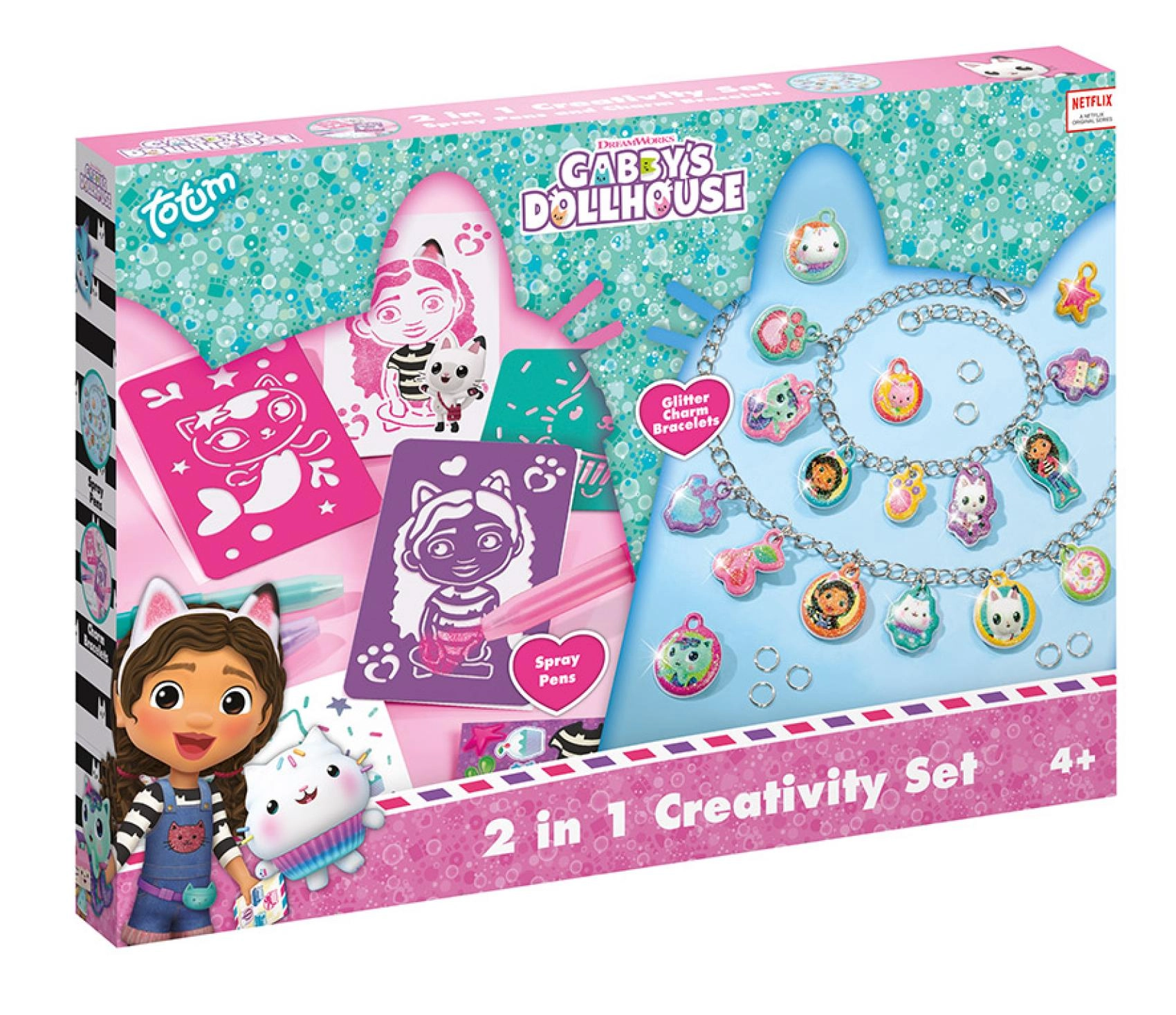 Objavte zábavnú kreatívnu sadu 2v1, s ktorou deti vytvoria vlastné obrázky pomocou fúkacích fixiek a navyše si vyrobia štýlové náramky s príveskami s motívmi GABBY'S DOLLHOUSE. Sada rozvíja kreativitu, jemnú motoriku a fantáziu – ideálny darček pre malých tvorcov od 4 rokov.