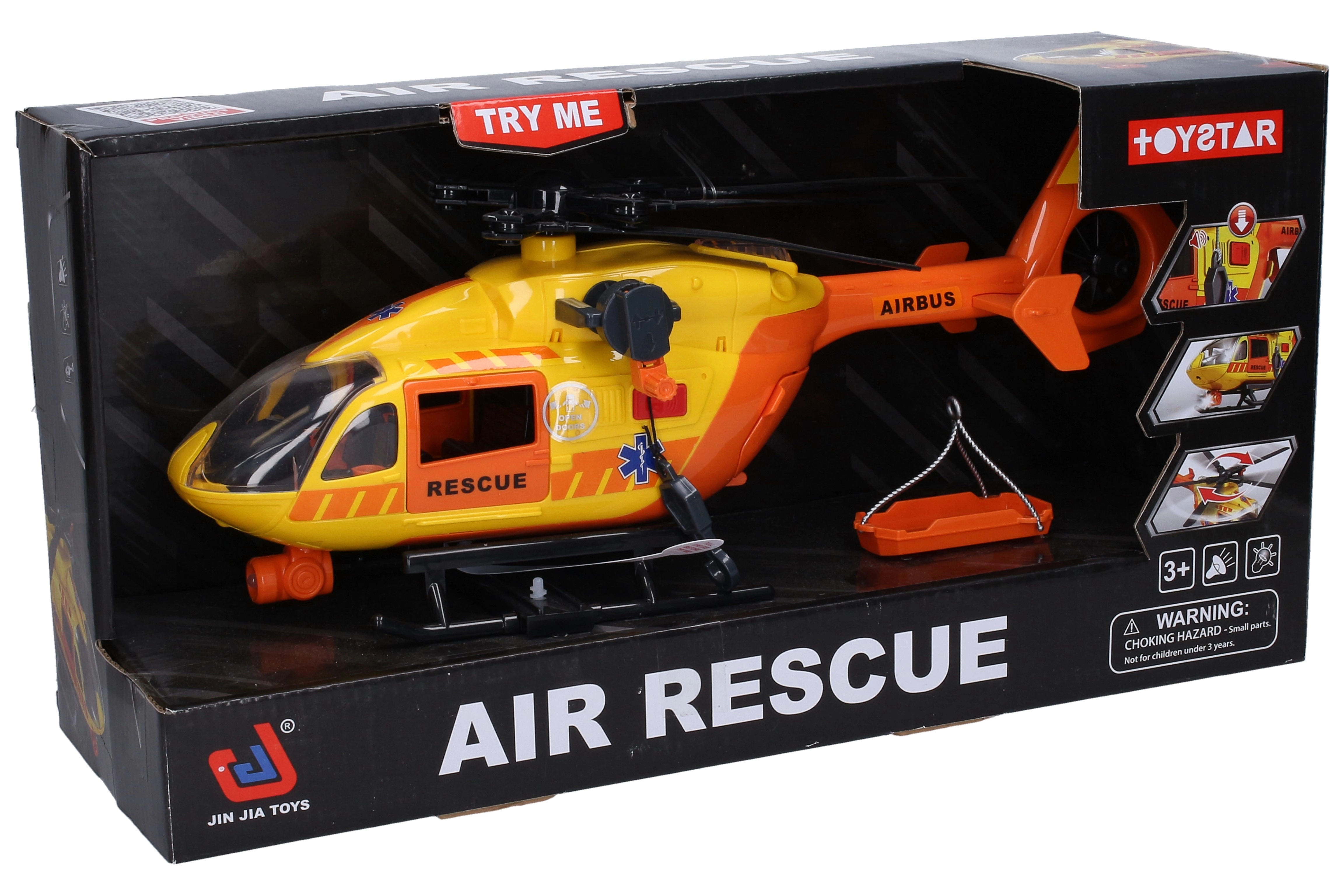 Na dramatické záchrany z ťažko dostupných miest slúži vysúvacie lano s hákom ovládané otočnou páčkou. Súčasťou je aj ležadlo, ktoré možno zavesiť na hák. Hra je pripravená okamžite – 2× AAA batérie sú súčasťou a vkladajú sa zo spodnej strany vrtuľníka.