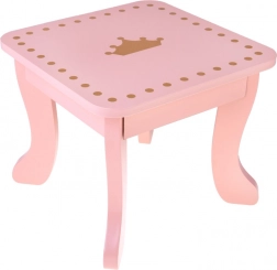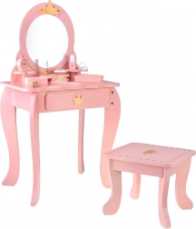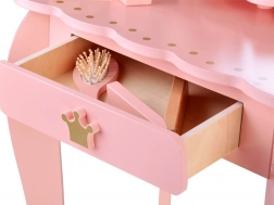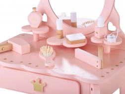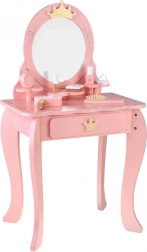 Ružová drevená toaletka pre malé princezné so zlatými korunkami a bezpečným zrkadlom premení každú detskú izbu na čarovné kráľovstvo. Súčasťou je stolička, praktická zásuvka na poklady a bohatá sada kaderníckych a kozmetických doplnkov na kreatívnu hru na stylistku.