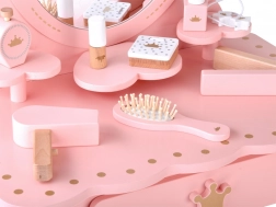 Súčasťou sady je aj pohodlná stolička a množstvo drevených a plastových doplnkov: kefa, fén, žehlička na vlasy, gumičky, rúž, očné tiene, parfém, lak na nechty a tri srdiečkové poháriky na odkladanie drobností. Jemná kombinácia ružovej, zlatej a strieborných detailov krásne ladí do detskej izby.