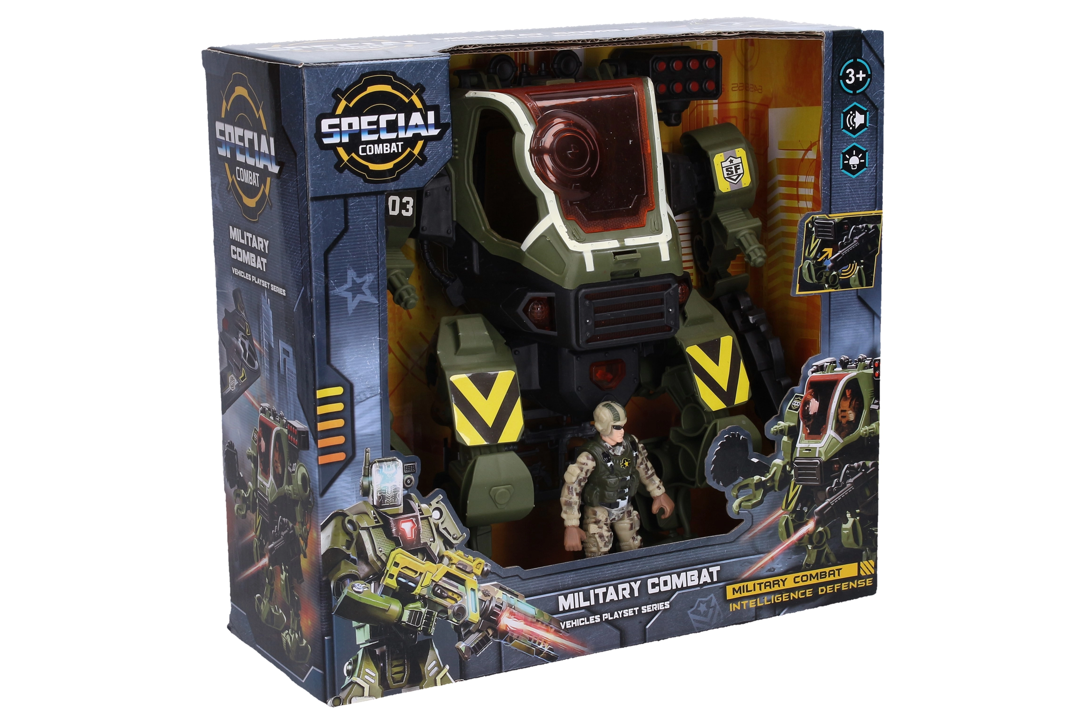 Užite si akčnú zábavu s týmto bojovým robotom mecha s výškou 26 cm, ktorý ponúka svetelné a zvukové efekty. Súčasťou je figúrka pilota 11 cm a batérie v balení pre okamžitú hru. Jednoduché ovládanie tlačidlom uprostred robota umožňuje prepínať rôzne zvuky, ako je pohyb či streľba.