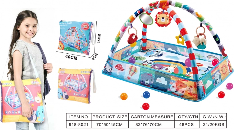 Odnímateľný oblúk je osadený rôznorodými hračkami: bezpečné zrkadielko, hríbik s hrkálkou a hryzátkom, včielka s hryzátkom a hrkálkou, samostatné hryzátko a levíček s pískatkom. Podložku možno jednoducho premeniť na ohrádku alebo suchý bazénik a doplniť ju priloženými loptičkami. Celý set je uložený v farebnej taške cez rameno na pohodlné prenášanie.