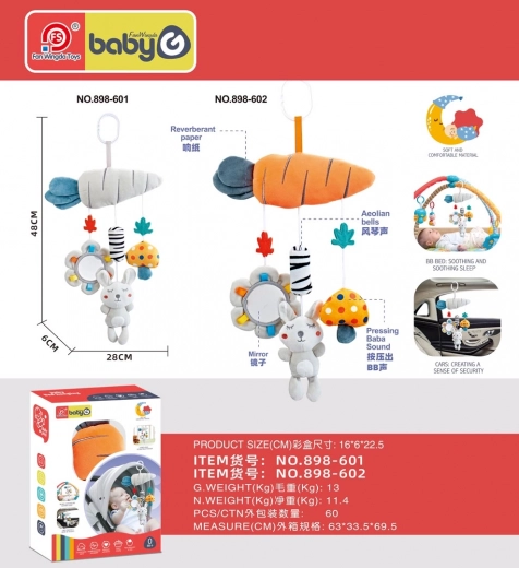 Závesná senzorická hračka na kočík, postieľku alebo autosedačku je vhodná od prvých dní života. Je vyrobená z mäkkých a bezpečných materiálov, ponúka šuchotavé a pískacie prvky, veterné zvončeky a bezpečné zrkadielko. Živé farby podporujú sústredenie, uchopovanie a rozvoj zmyslov bábätka.