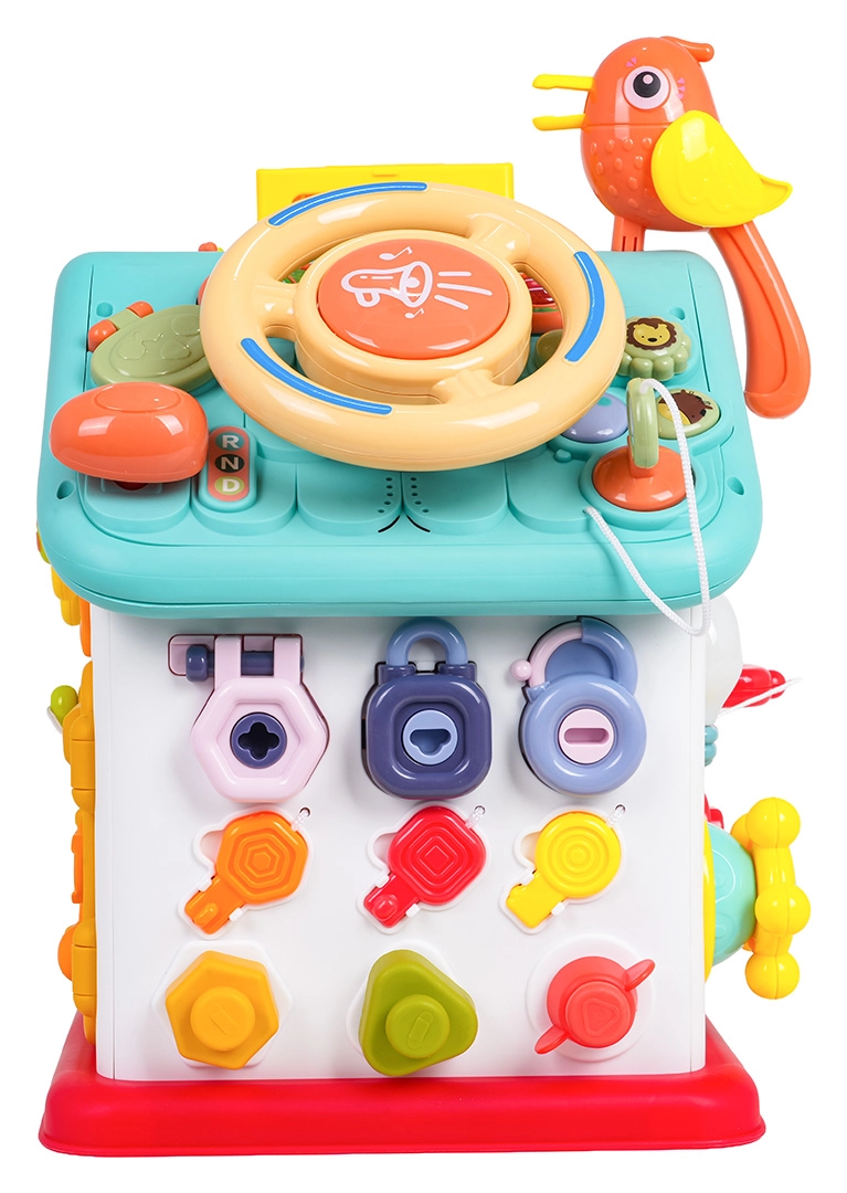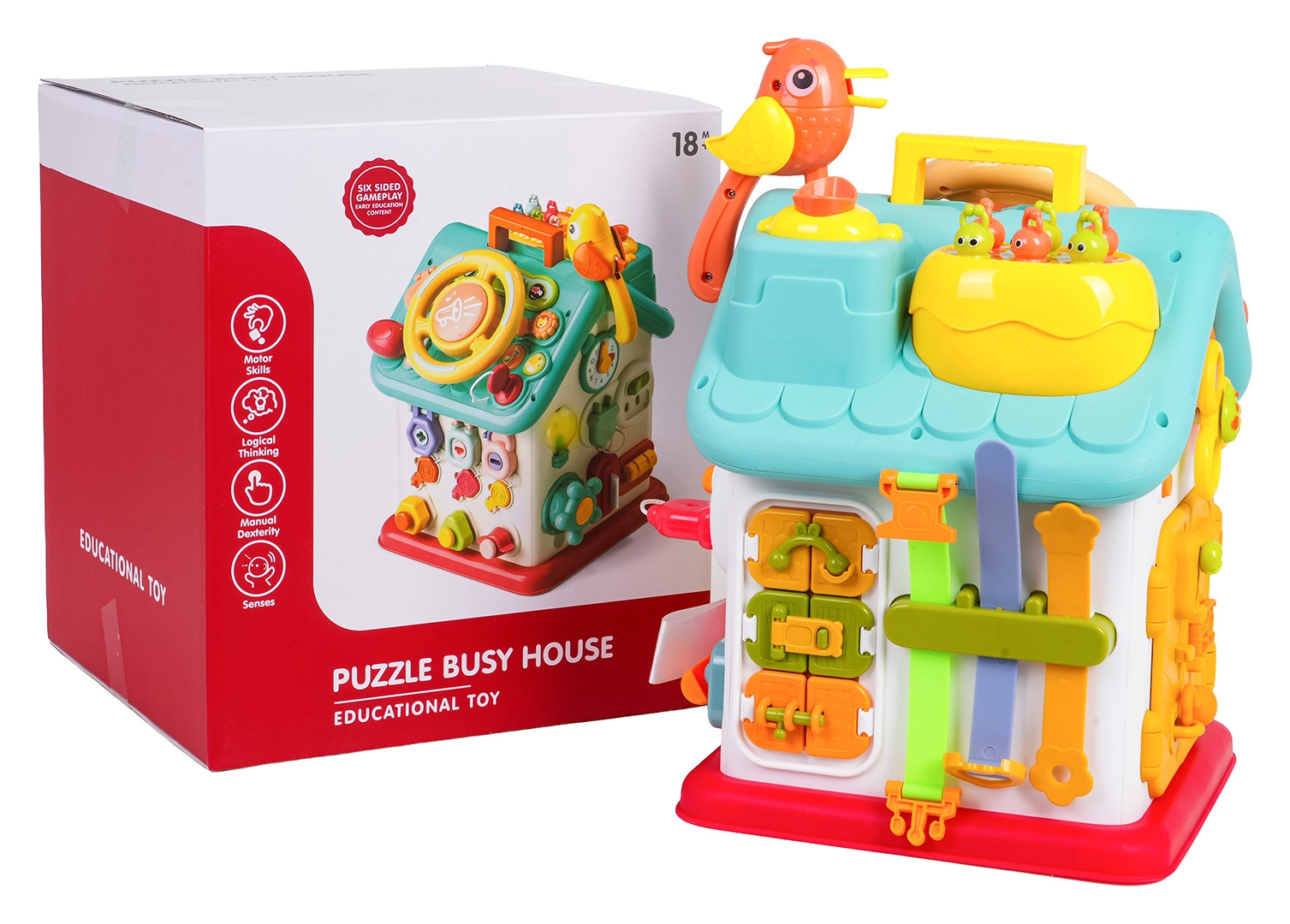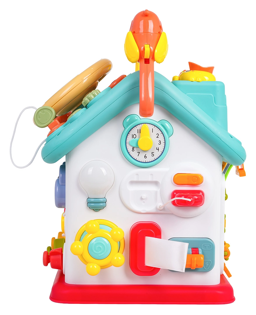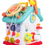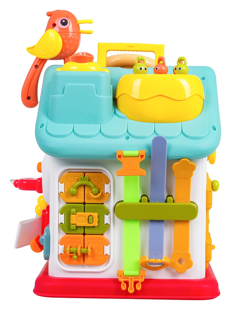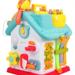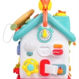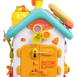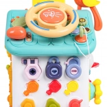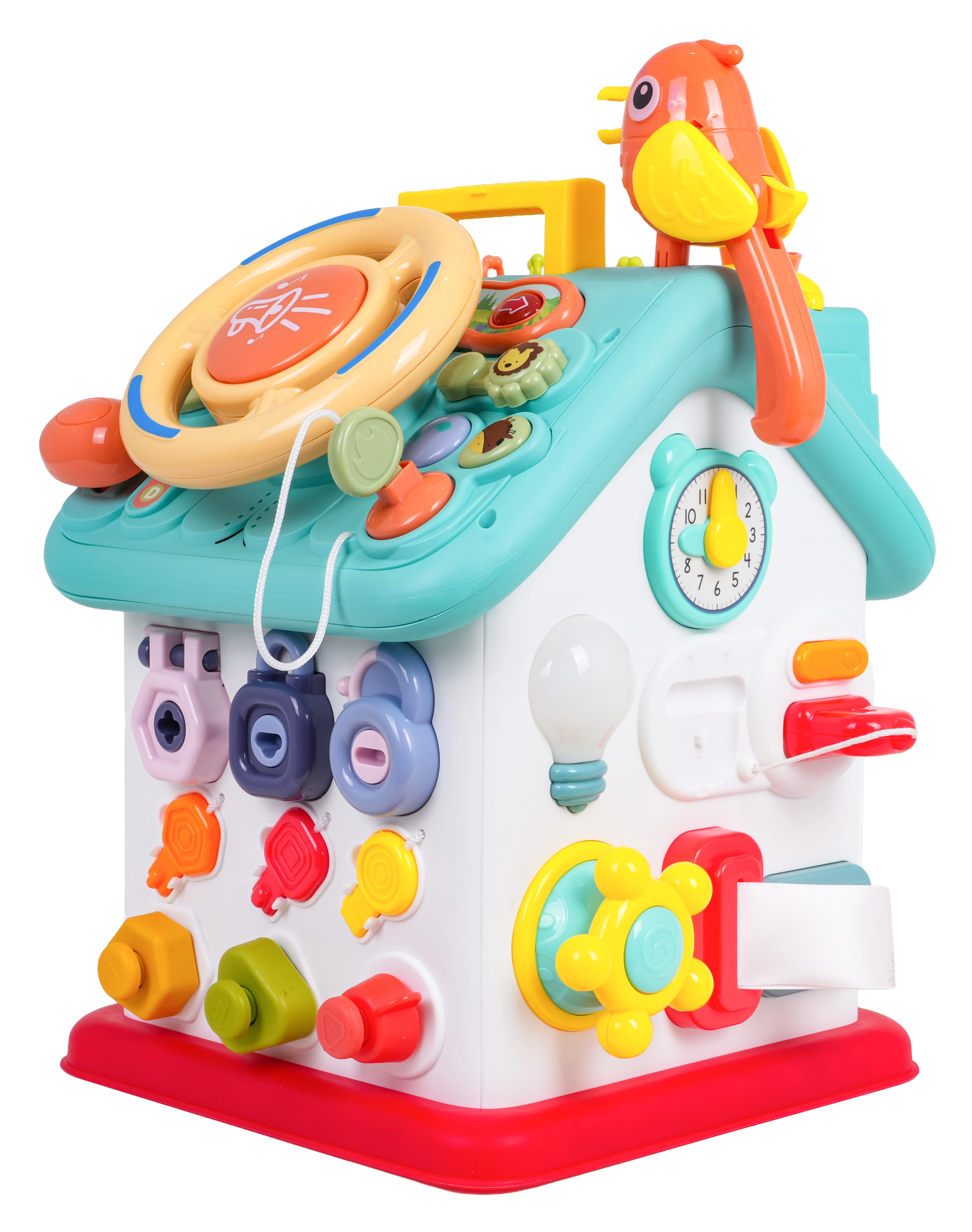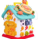 Tento farebný interaktívny domček ponúka bohaté aktivity na všetkých stranách aj na streche: podsvietený volant s klaksónom, smerovkami a štartérom s kľúčikom, sadu zámkov a kľúčov na párovanie, hodiny s pohyblivými ručičkami, vypínače, prevody a ďalšie manipulatívne prvky. Deti si precvičia koordináciu oko–ruka a pochopia princíp príčina–následok.