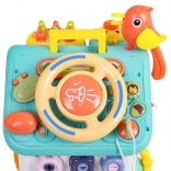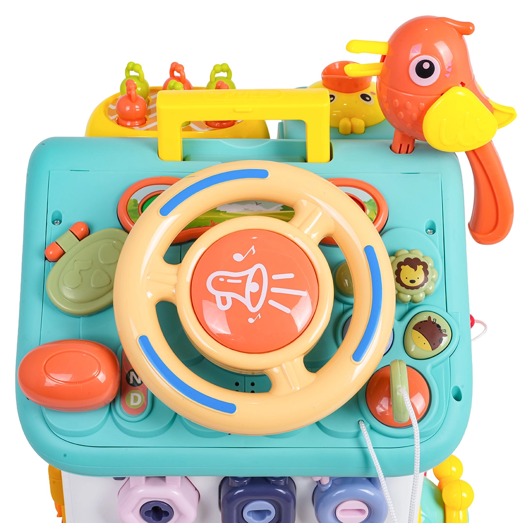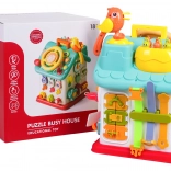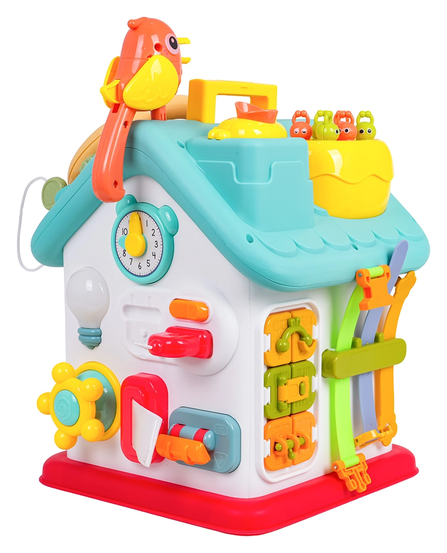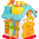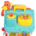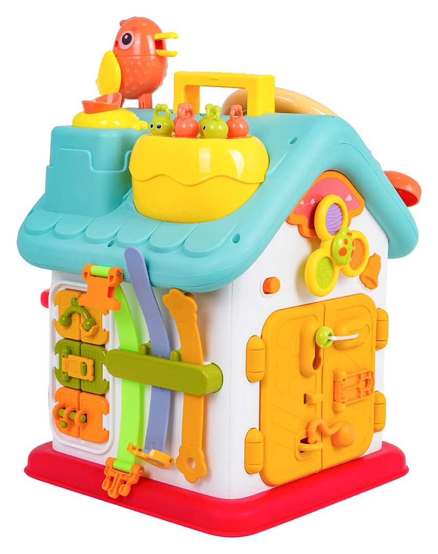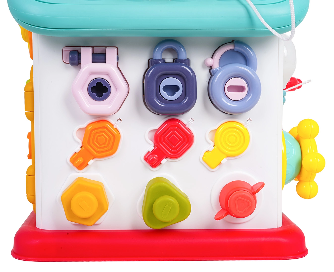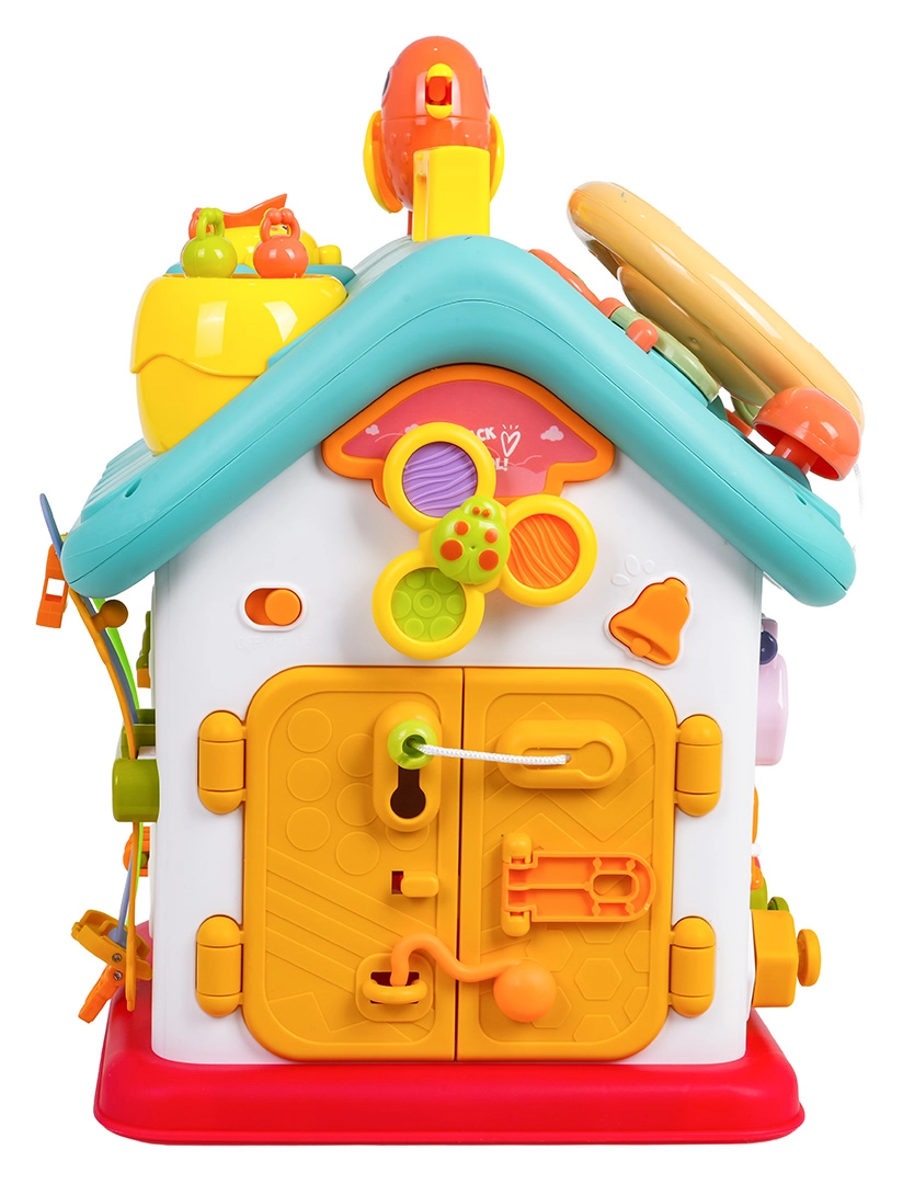 Tento farebný interaktívny domček ponúka bohaté aktivity na všetkých stranách aj na streche: podsvietený volant s klaksónom, smerovkami a štartérom s kľúčikom, sadu zámkov a kľúčov na párovanie, hodiny s pohyblivými ručičkami, vypínače, prevody a ďalšie manipulatívne prvky. Deti si precvičia koordináciu oko–ruka a pochopia princíp príčina–následok.
