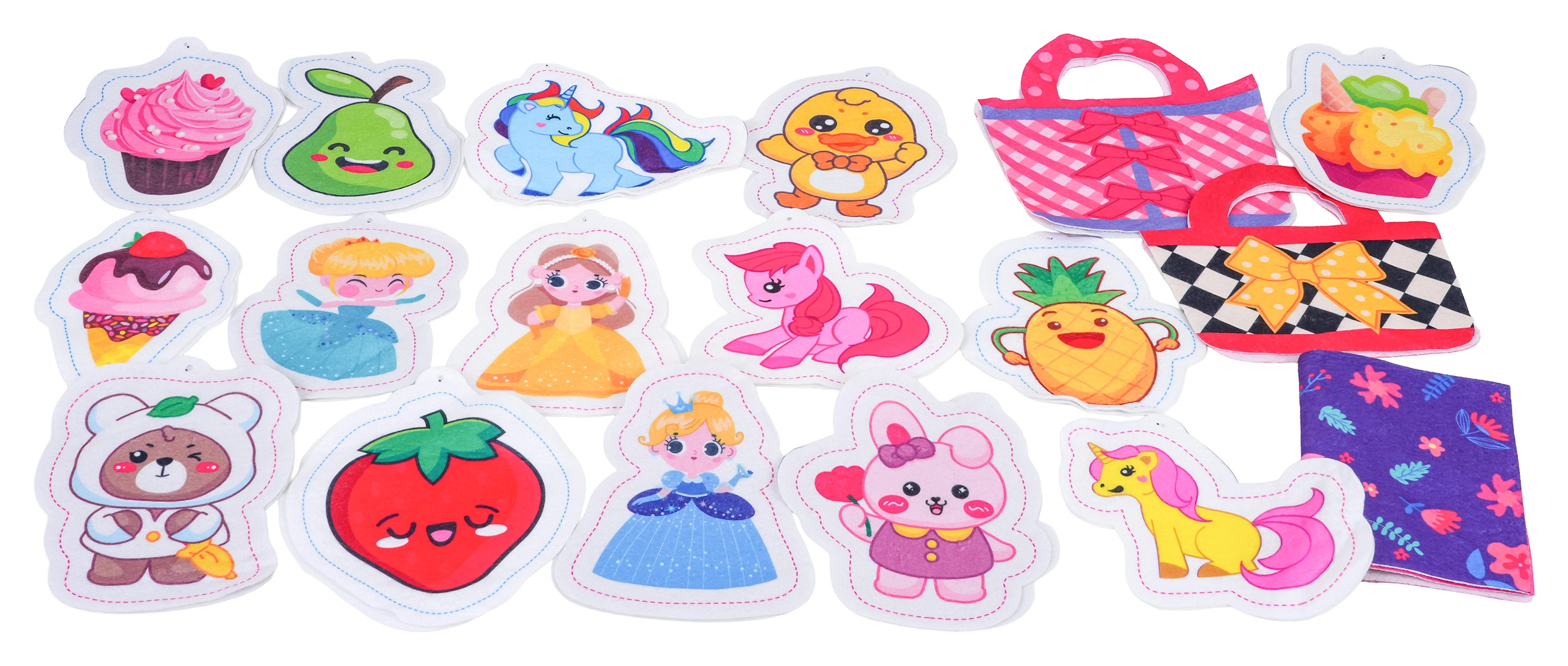 Súčasťou sady sú filcové predlohy na kabelky, textilné diely, šablóny na výrobu plyšových ozdôb, výplň, guľôčkové retiazky a nožnice – všetko, čo deti potrebujú na výrobu vlastných doplnkov a roztomilých príveskov. Hra podporuje koordinačné zručnosti, trpezlivosť a tvorivosť.