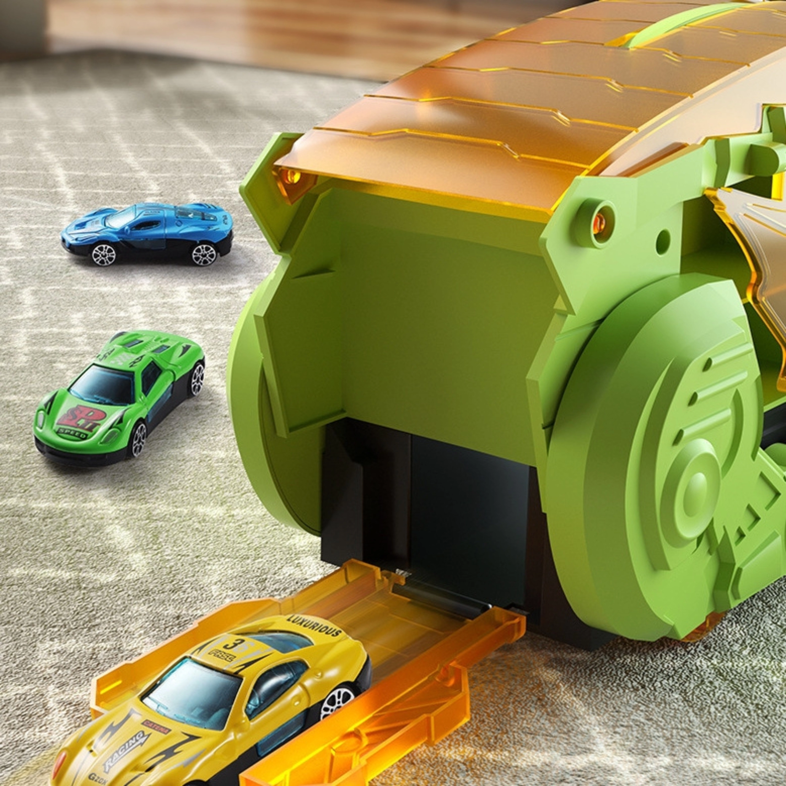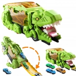 Dinosauří ťahač sa behom chvíľky premení na akčné ihrisko: rozložte oranžovú rampu, naložte autíčka a nechajte ich vyraziť z otvorenej dinosaurej tlamy. Vďaka praktickému madlu a vnútorným priehradkám všetky vozidlá ľahko uložíte a vezmete kamkoľvek so sebou. Živé farby a výrazné detaily podnecujú fantáziu a lákajú ku hre.