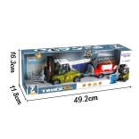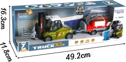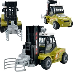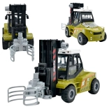 Realistický model v mierke 1:43 poteší malých nadšencov stavebných a prepravných strojov. Vysokozdvižný vozík má setrvačný pohon – stačí postrčiť a rozbehne sa vpred. Pohyblivé rameno s kliešťovým úchopom umožní dvíhať a prenášať drevené kláty, zatiaľ čo príves s otváracími bočnicami uľahčuje nakládku a vykládku.