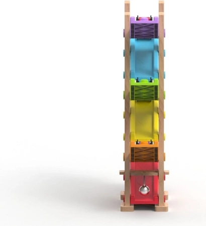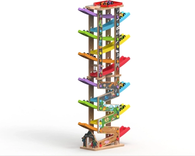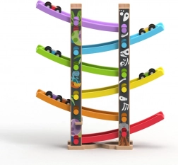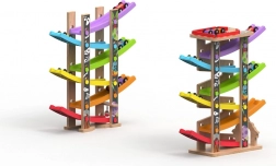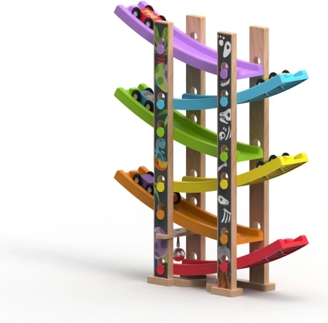 Táto veľká drevená závodná dráha prináša do detskej izby viac rýchlosti aj zábavy. Vďaka šiestim pestrofarebným rampám deti sledujú plynulú jazdu autíčok a objavujú princípy gravitácie a príčiny–následku. Dráhu môžete používať úplne samostatne alebo ju pripojiť ako rozšírenie k vašej existujúcej trati pre ešte dlhšiu a dynamickejšiu jazdu.