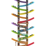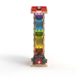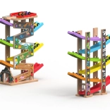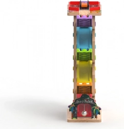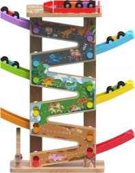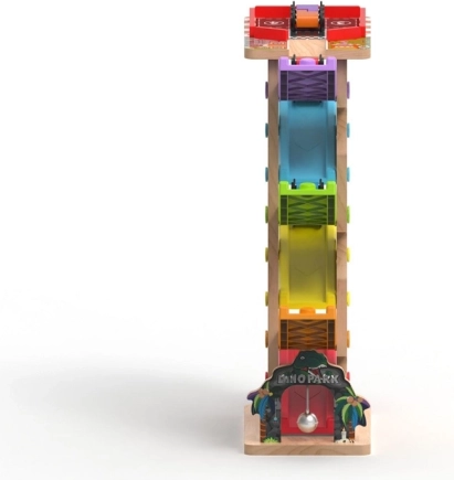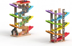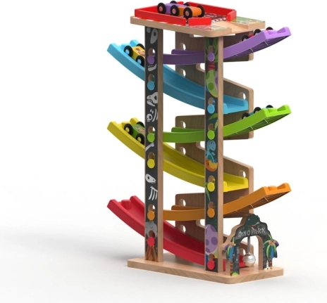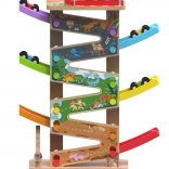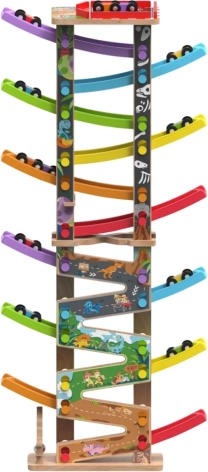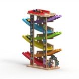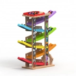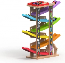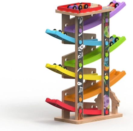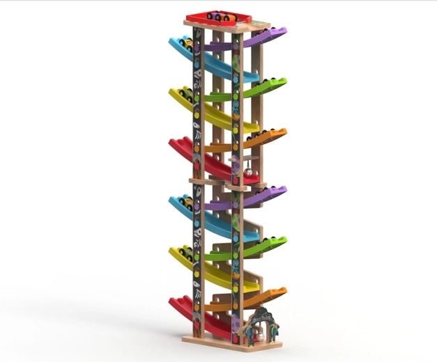 Táto vertikálna drevená pretekárska veža s 6 farebnými rampami prináša dynamickú hru založenú na gravitácii. Deti umiestnia autíčko hore a sledujú, ako sviští nadol cez jednotlivé úrovne, zákruty a mostíky. Vďaka stabilnej konštrukcii a kompaktným rozmerom sa dráha hodí do detskej izby aj herne a obstojí aj pri intenzívnom používaní.