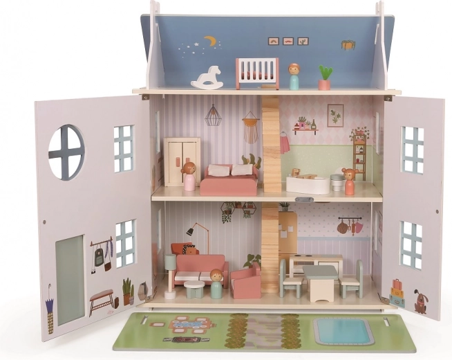 Domček je vyrobený z kvalitného dreva a doplnený textilnými a plstenými prvkami. Súčasťou je nábytok a postavičky, takže deti môžu začať hrať okamžite. Otváracie panely uľahčujú prístup do interiéru a detailné potlače miestností podporujú realistickú hru. Robustná konštrukcia zaručuje dlhú životnosť a bezpečné používanie.