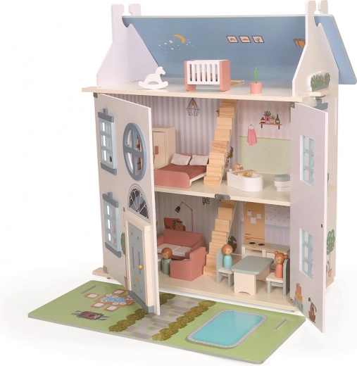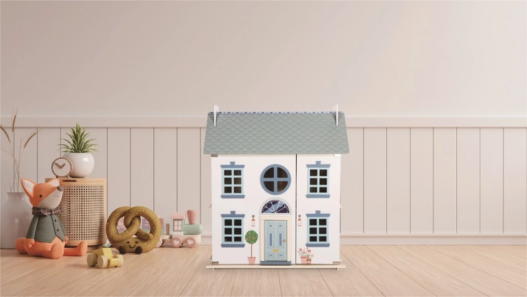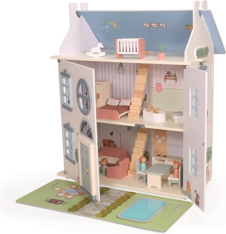 Tento nadčasový drevený domček pre bábiky je navrhnutý pre imaginatívne hry detí od 3 rokov. Ponúka tri poschodia s priestrannými miestnosťami – modernú kuchyňu, kúpeľňu, útulnú spálňu, obývačku a detskú izbu v podkroví. Prednú časť strechy možno zložiť, otočiť a položiť pred domček, čím vznikne záhrada s bazénom a posedením.