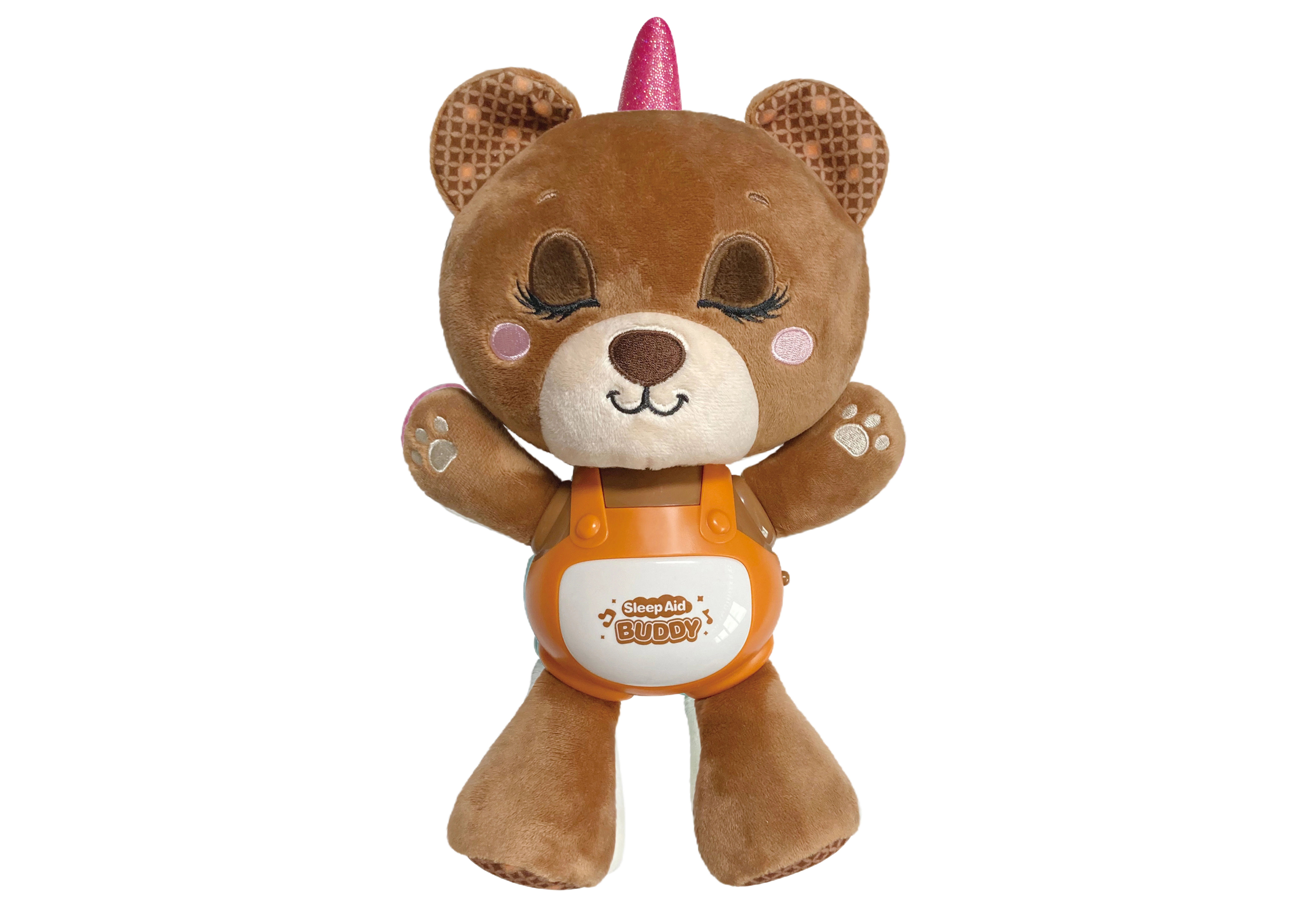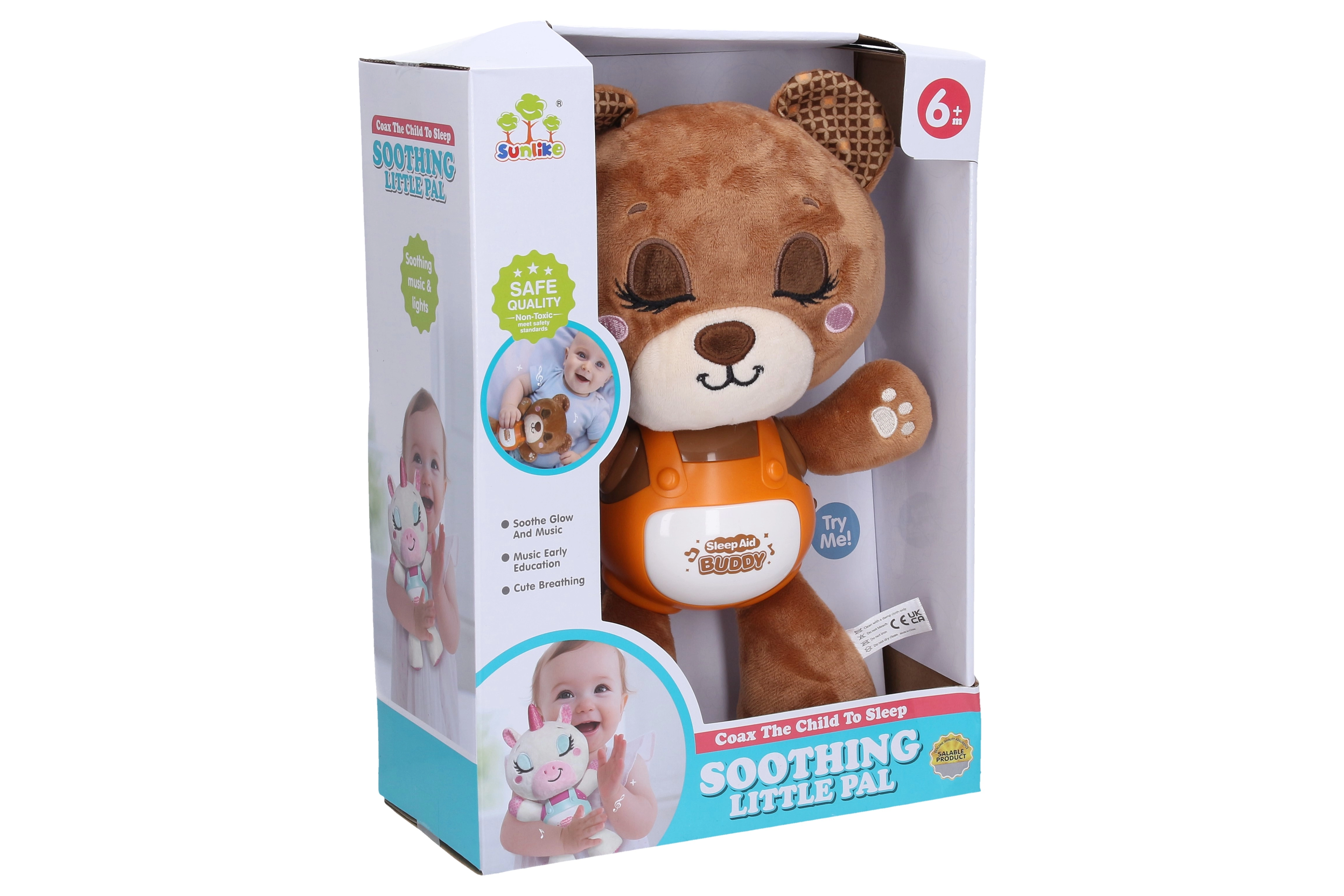 Roztomilý uspávačik v tvare medvedíka s veľkosťou 29 cm pomáha deťom pokojne zaspať vďaka kombinácii ukolísaniek, upokojujúcej hudby, zvuku chrápania a jemného nočného svetla. Ovládanie je jednoduché – stačí stlačiť bruško a prepínať medzi režimami. Praktický prepínač on/off je umiestnený na boku.