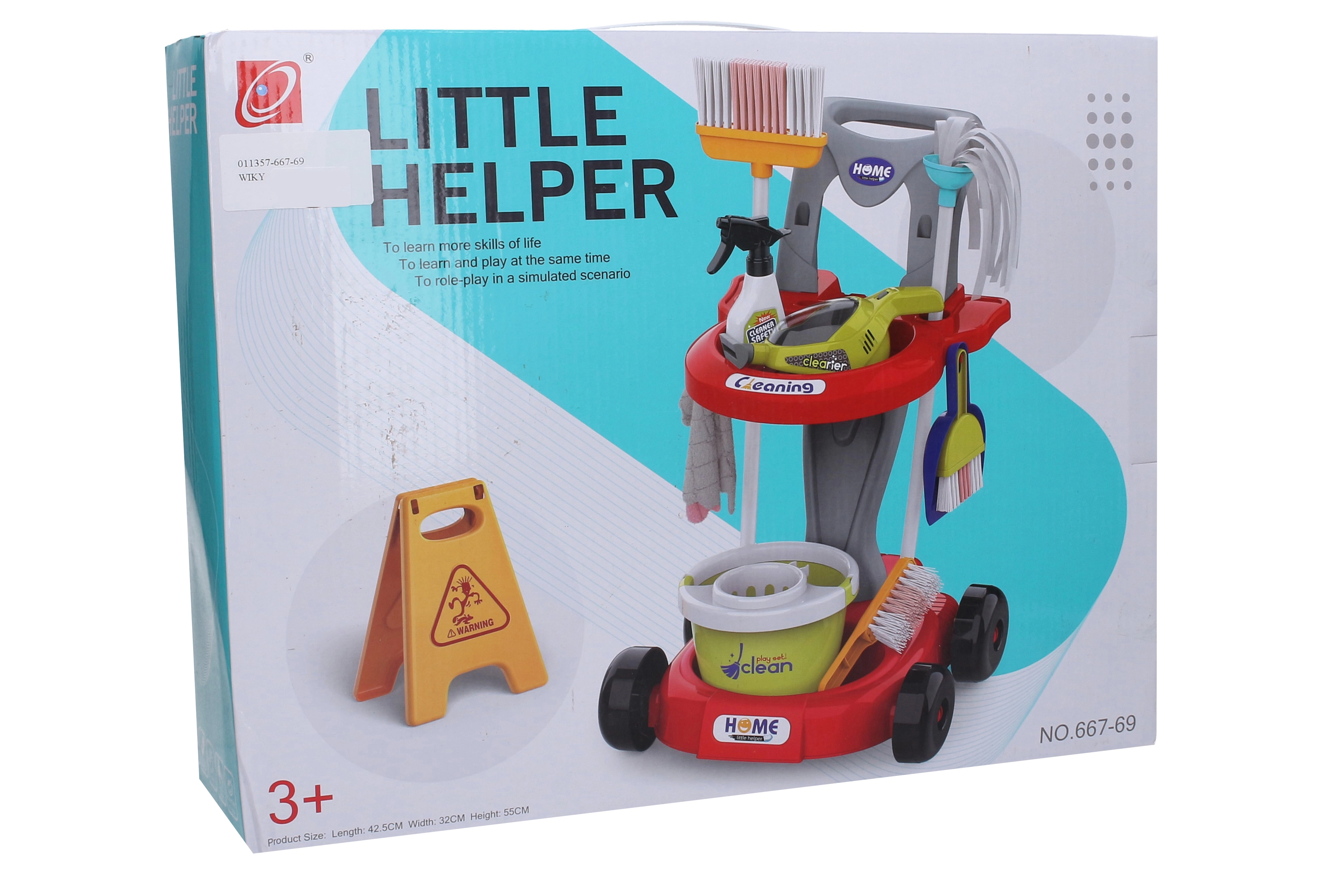 Zábavný a praktický detský upratovací vozík vysoký 55 cm prináša všetko potrebné na hru na domácnosť. Súprava obsahuje vozík, metličku s lopatkou, mop, metlu, ručný vysávač, rozprašovač, vedro a výstražnú tabuľu „Pozor, mokrá podlaha“. Zostavenie je jednoduché vďaka priloženému návodu, vysávač vyžaduje 3× AA batérie (nie sú súčasťou balenia).