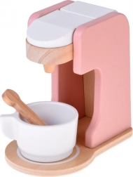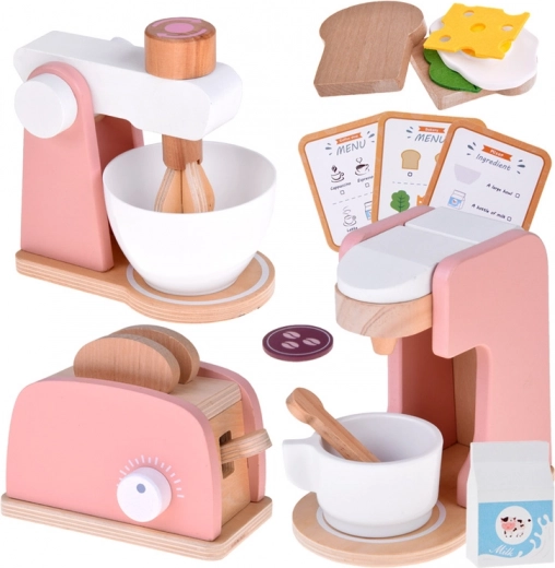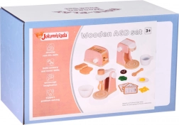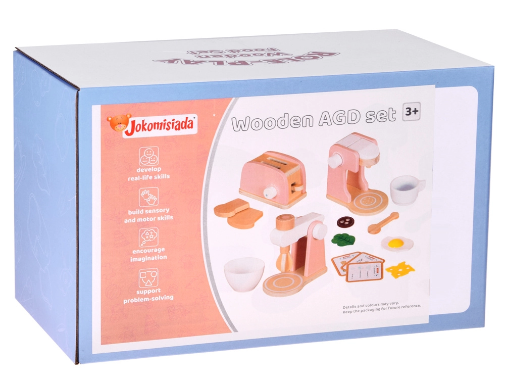 Štýlová drevená sada malého AGD prenesie detskú kuchynku do sveta fantázie. Obsahuje toustovač s pákou a otočným gombíkom, kávovar so šálkou, lyžičkou a kapsulou a stolový mixér s miskou a otáčacím metličkovým nadstavcom. Kvalitné prírodné drevo, netoxické farby a pastelový dizajn zabezpečia bezpečnú a krásnu hru, ktorá rozvíja jemnú motoriku, kreativitu a hru na role.