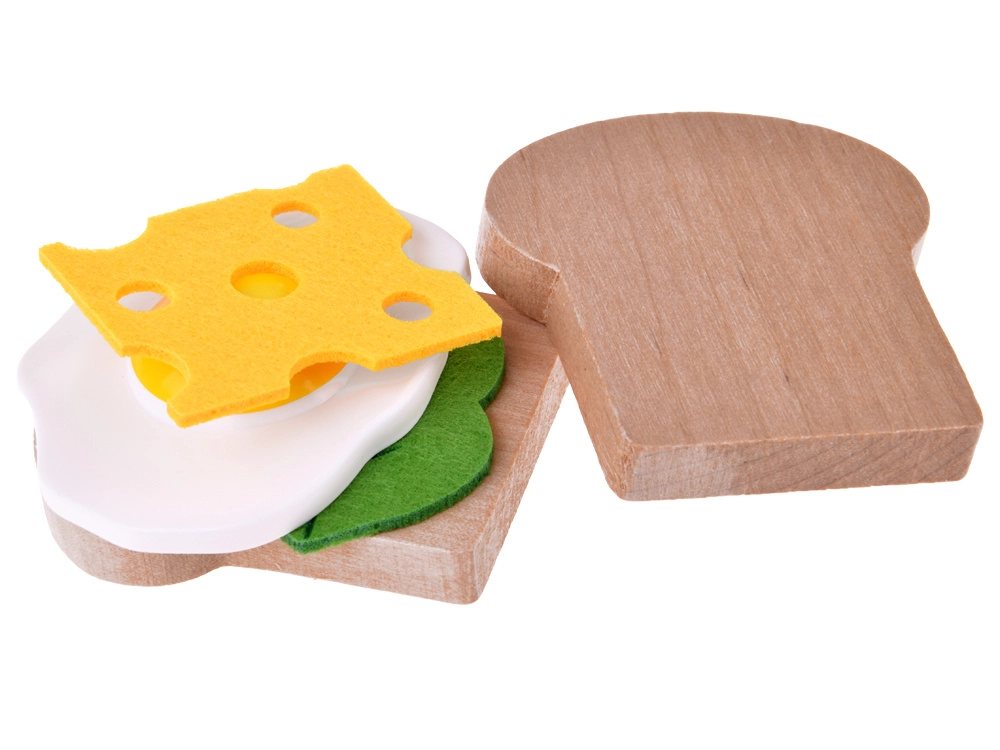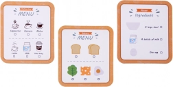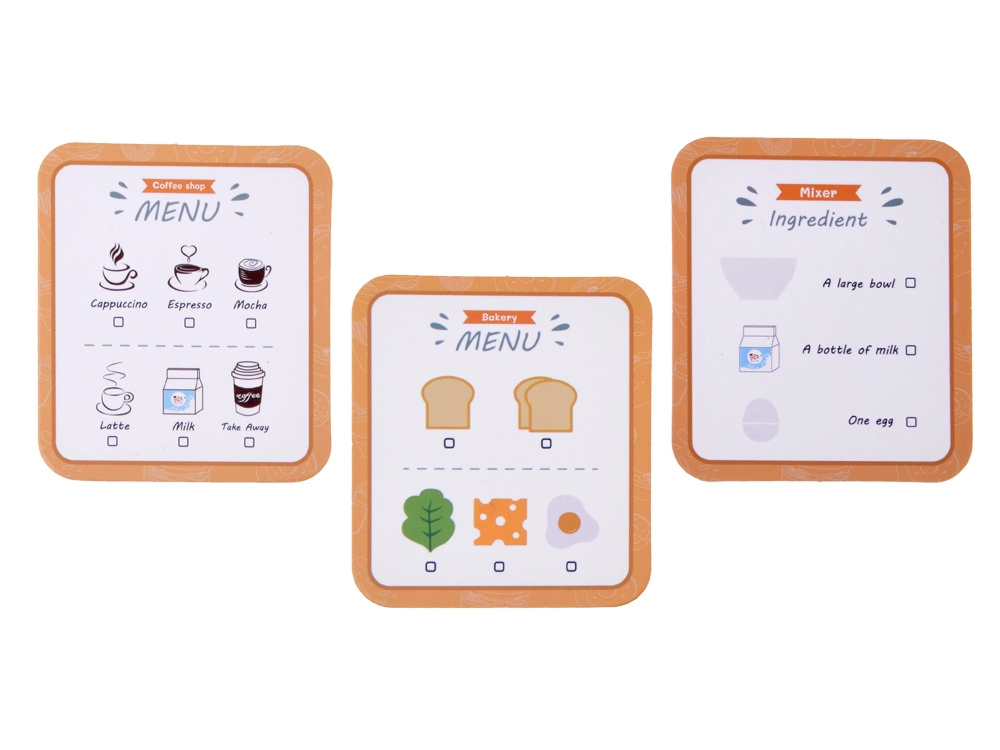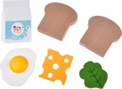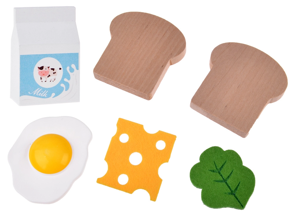 Súčasťou je bohaté príslušenstvo: drevené krajce chleba, falošné vajíčko, plátok syra, lístok šalátu, kartónik mlieka, kávová kapsula a karty menu/receptov pre ešte zábavnejšiu hru.