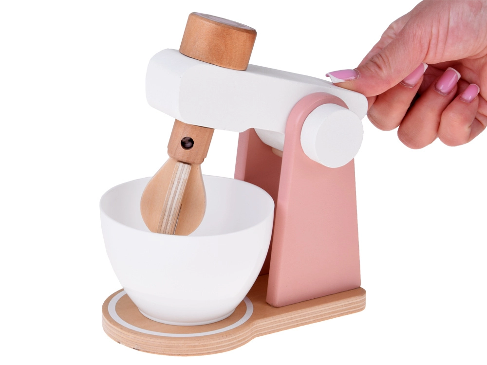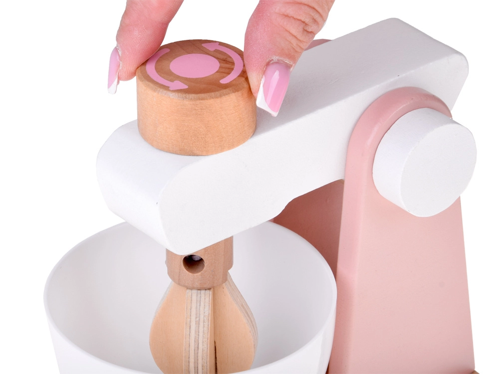 Stabilná drevená konštrukcia, odnímateľná miska a funkčný otočný gombík na simuláciu miešania cesta či krému. Ideálne pre malého cukrára.