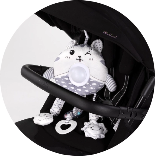 Plyšová mačička Big Kitty je ideálny spoločník pre bábätko – upokojí, zabaví a podporí zmyslové vnímanie. Vďaka univerzálnemu háčiku ju ľahko pripevníte na kočík, autosedačku alebo k postieľke. Príjemné materiály, jemné farby a svetelné efekty vytvárajú pohodovú atmosféru na hranie aj zaspávanie.