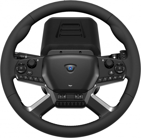 Volant s priemerom 40 cm s povrchom z umelej kože a rozsahom 1800° prináša autentický pocit z riadenia ťažkých nákladných vozidiel na ceste aj v depe.
