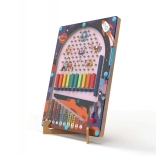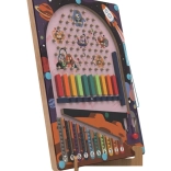 Farebná hracia doska s kolíkmi, dráhami a bodovanými poľami rozvíja jemnú motoriku, koordináciu ruka–oko a trpezlivosť pri každom pokuse.