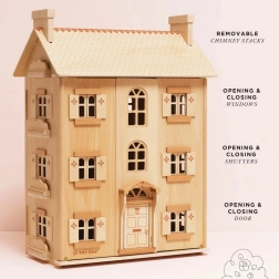 Tento vysoký domček pre bábiky z certifikovaného FSC dreva je navrhnutý tak, aby inšpiroval k dlhotrvajúcej a kreatívnej hre. Vďaka precíznym detailom a plne funkčným prvkom – otváracím oknám, okeniciam aj dverám – si deti ľahko vytvoria vlastné príbehy a svet fantázie, ktorý môžu zdieľať celé roky.