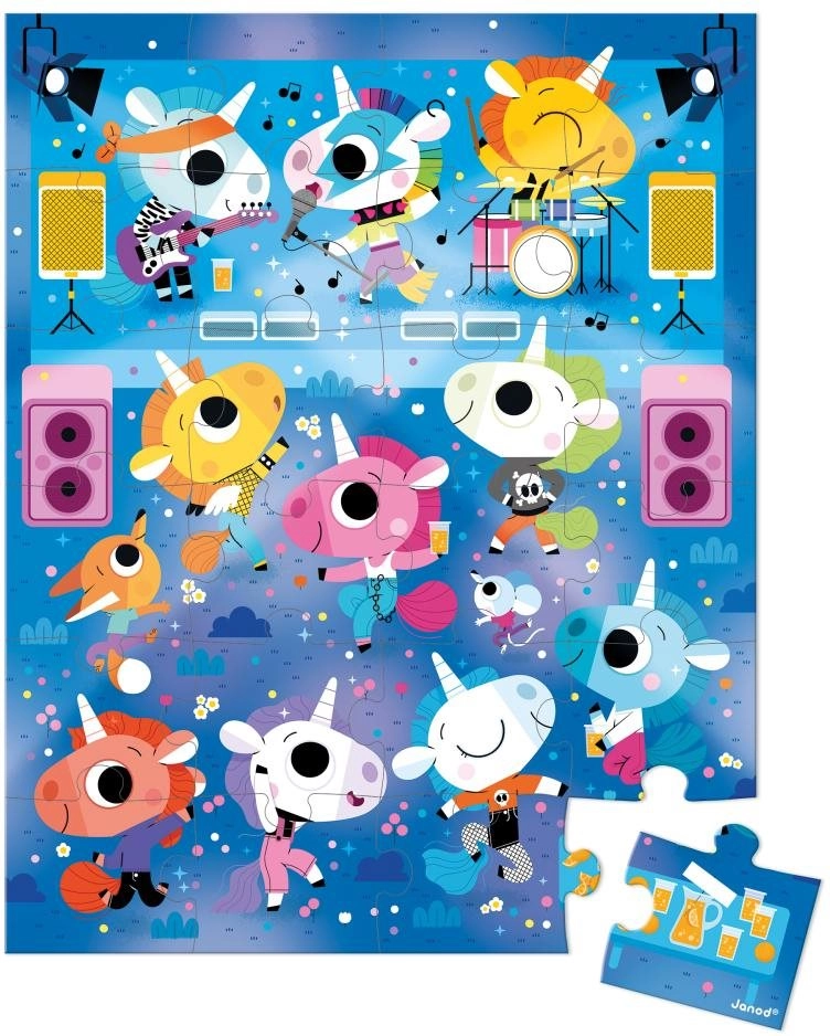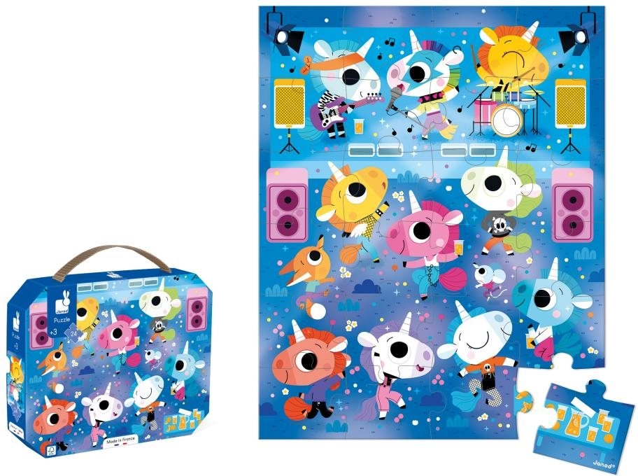 Objavte pôvabné puzzle v kufríku od značky Janod s témou koncertu jednorožcov. Vďaka 24 pevným dielikom deti ľahko zložia veľký obrázok s rozmerom cca 50 × 40 cm. Praktický kartónový kufrík s uškom je ideálny na doma aj na cesty a udrží všetky dieliky pokope.