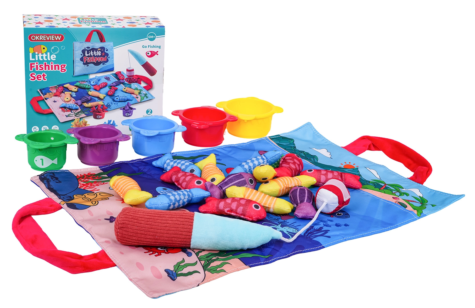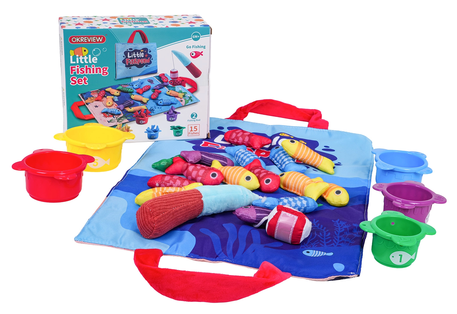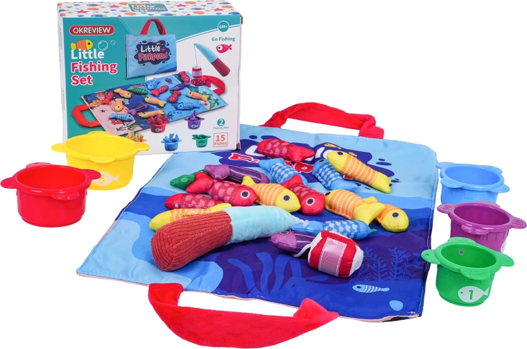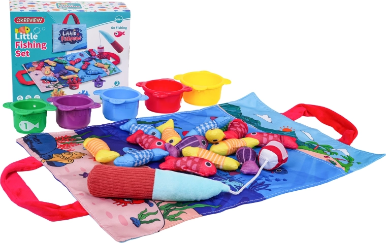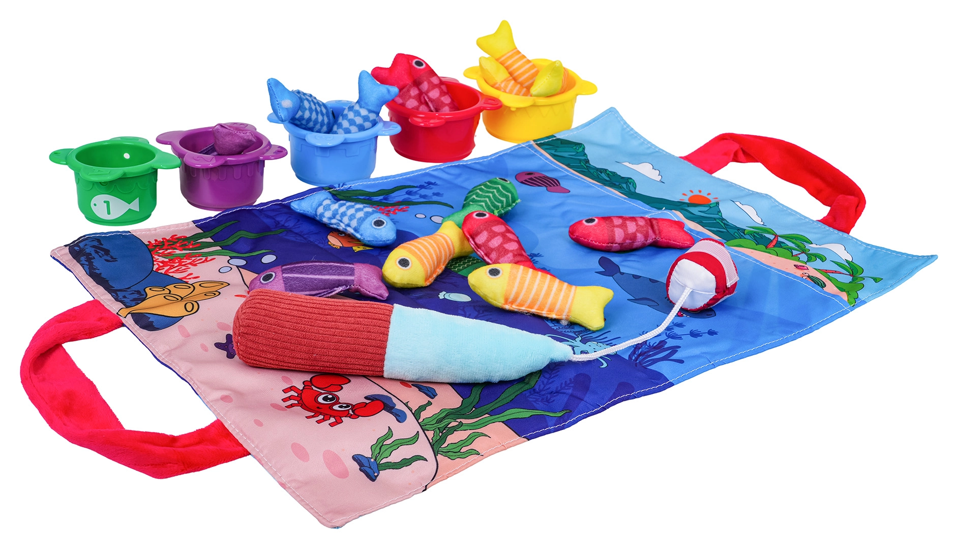 Objavte hravú aktivitu pre najmenších: mäkký rybársky set s látkovou podložkou, 15 rybkami, 5 kelímkami a mäkkým prútom na suchý zips. Podporuje rozvoj jemnej motoriky, koordináciu oko–ruka, učenie farieb a číslic aj triedenie a počítanie. Praktická podložka s úchytmi na prenášanie slúži aj ako taška na uloženie celého setu.