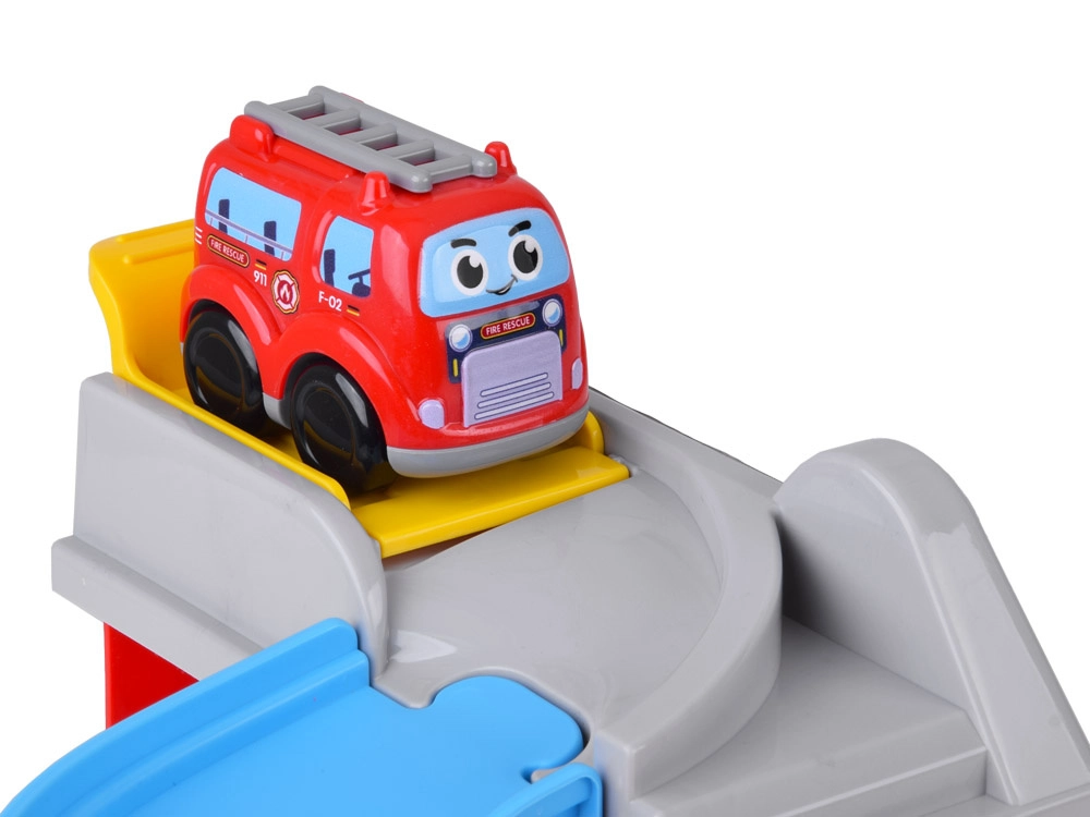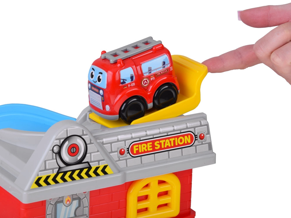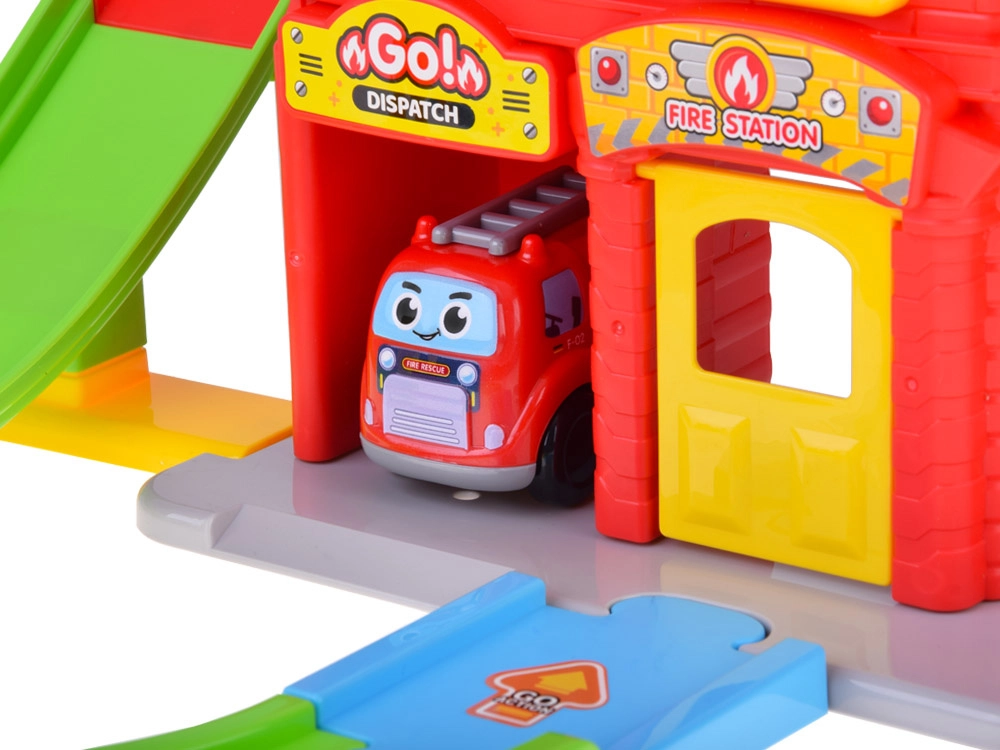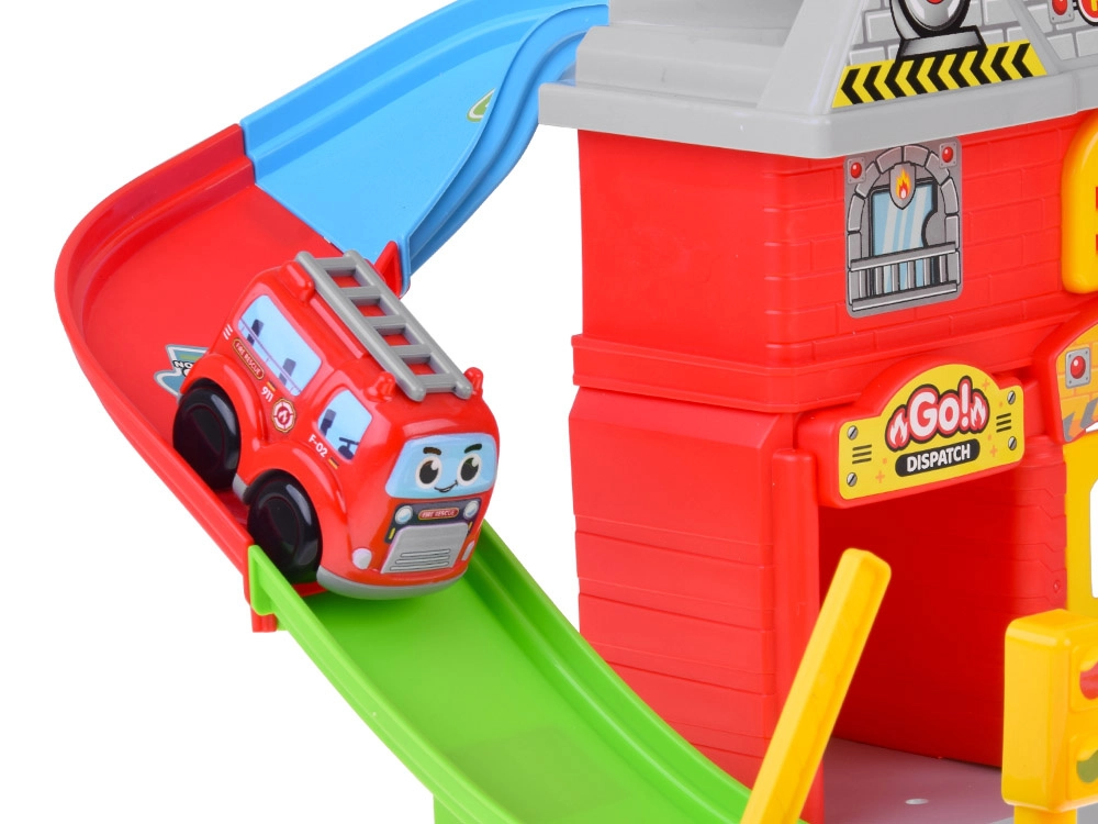 Dynamický zjazd vedie z vrcholu stanice nadol a vytvára akčnú jazdu pre hasičské autíčko – ideálne pre napínavé zásahy.