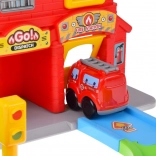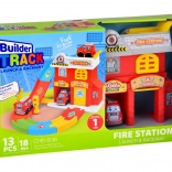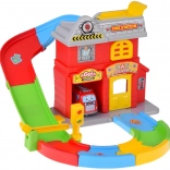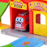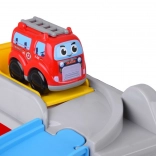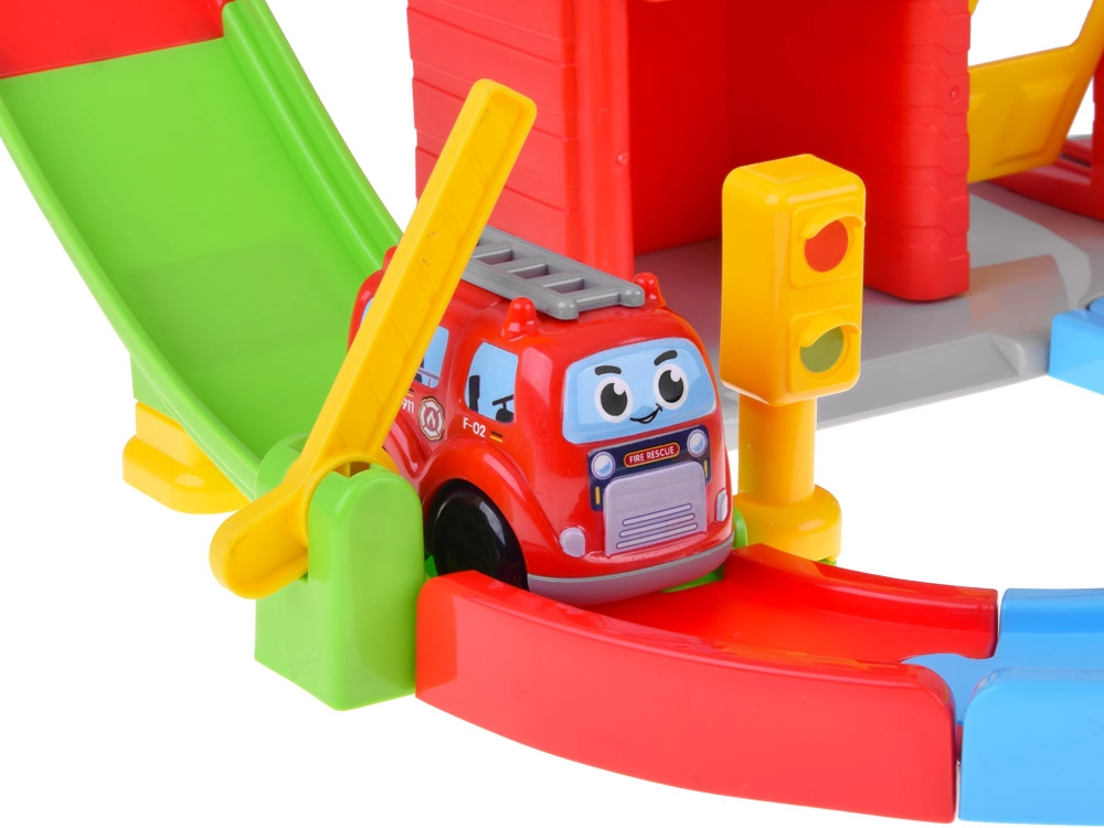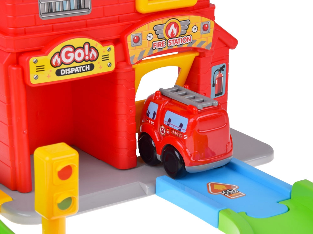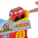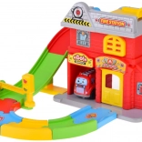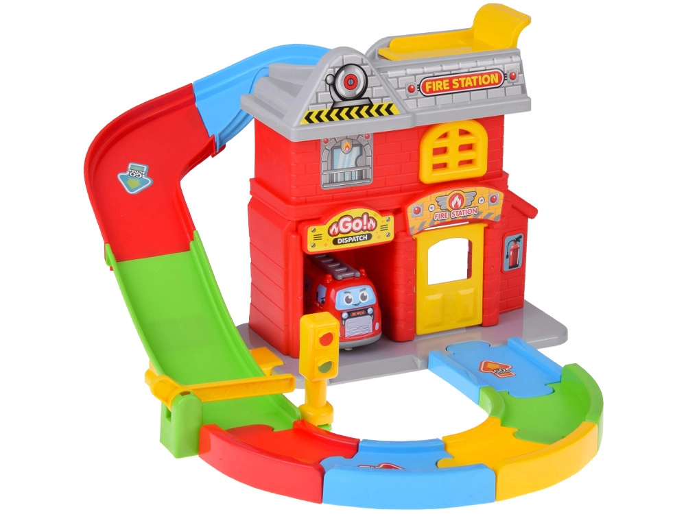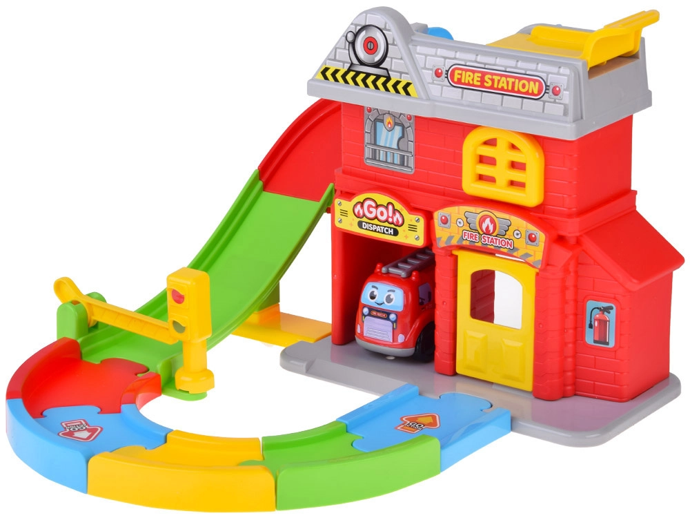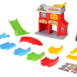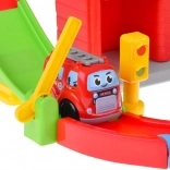 - Hasičská stanica s otváracími vratami a špirálovou dráhou, hasičské autíčko, závora a semafor
