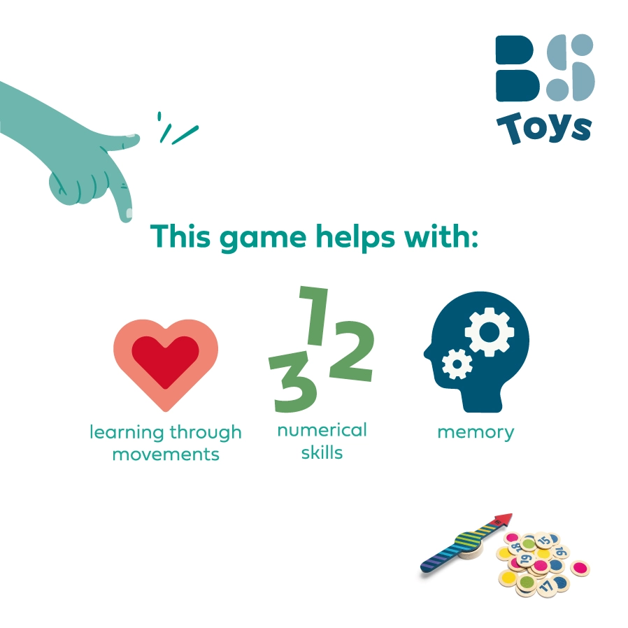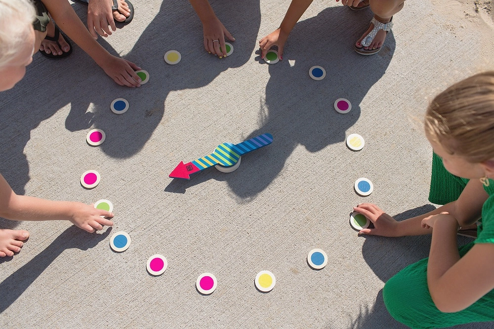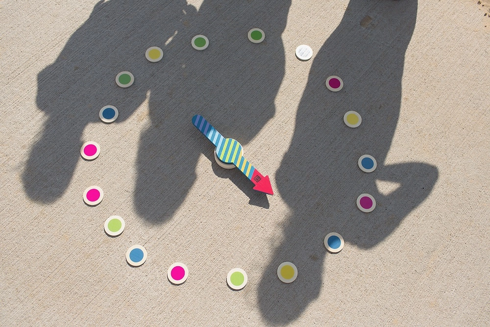 Ako sa hrá: hráči sa postavia okolo šípky, roztočia ju a osoba či úloha, na ktorú šípka ukáže, určí farbu alebo číslo. Následne všetci plnia výzvu – od hľadania predmetov podľa farby po rýchle počítanie a skákanie.