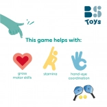 V balení nájdete kompletnú výbavu pre 2 hráčov: 2 drevené rakety (40 × 19 cm), 2 loptičky, prenášaciu sieť a tašku na jednoduché uloženie a transport. Pravidlá sa naučíte behom chvíľky a zahrať si môžete aj na menšom ihrisku – napríklad na školskom dvore alebo v telocvični.